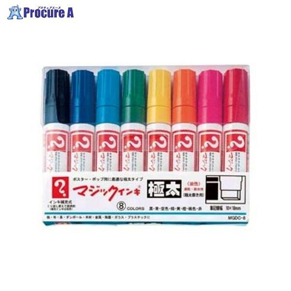 マルチカラー/-/MGDC-8・パッケージ個数:1・本体サイズ/重量:(単品)165x28x28mm/69g・パッケージサイズ:227x171x30mm/600g・筆記線幅:10x18mm・8色=黒/赤/青/緑/黄/茶/橙/紫[油性マーキングペン]「マジックインキ極太シリーズ」8色セット。●ポスター・ポップ用に最適な極太タイプ。…オフィスに、学校に、工場に。「インキ補充式、ペン先交換式」になっていますので、別売の補充液・替ペン先により繰り返し使えます。[GPN][インキ補充式][ペン先交換式]