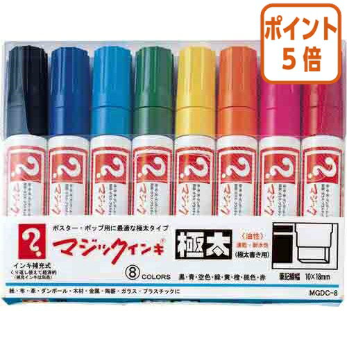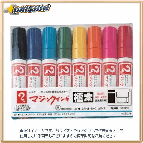 メール便発送商品(送料込み)※こちらの商品はメール便にて「ポスト投函」でのお届けになります。※代金引換はご利用いただけません。※お届け日時のご指定はできません。※宅配便送料別の商品と同梱の場合、宅配便の送料となります。※通常、出荷後1〜4日程度でのお届けとなります。※荷物問合せ番号よりお荷物の追跡が可能です。●筆記線幅:10×18mm●油性染料●インキ補充式●GPNデータベース商品●(1本サイズ)幅2.8×高2.8×奥行き16.5cm●インク色/黒、赤、青、緑、黄、橙、空、桃●線幅/10から18mm●油性インク●シングルタイプ●インク補充式●補充インク(黒、赤、青のみ)/MHJ60●単位(入数)/1セット(8色入)●メーカー品番/MGDC-8ポスターやポップアート作成に便利な極太。油性マジックの定番!18×10の極太サイズ。ポスター、ポップ、看板用に最適。