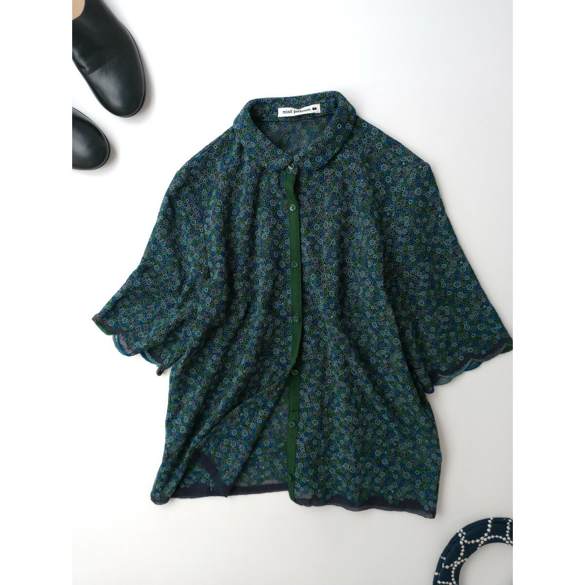 mina perhonen ミナペルホネン skyful 刺繍 スモールカラー 半袖 ブラウス シャツ グリーン 36【中古】
