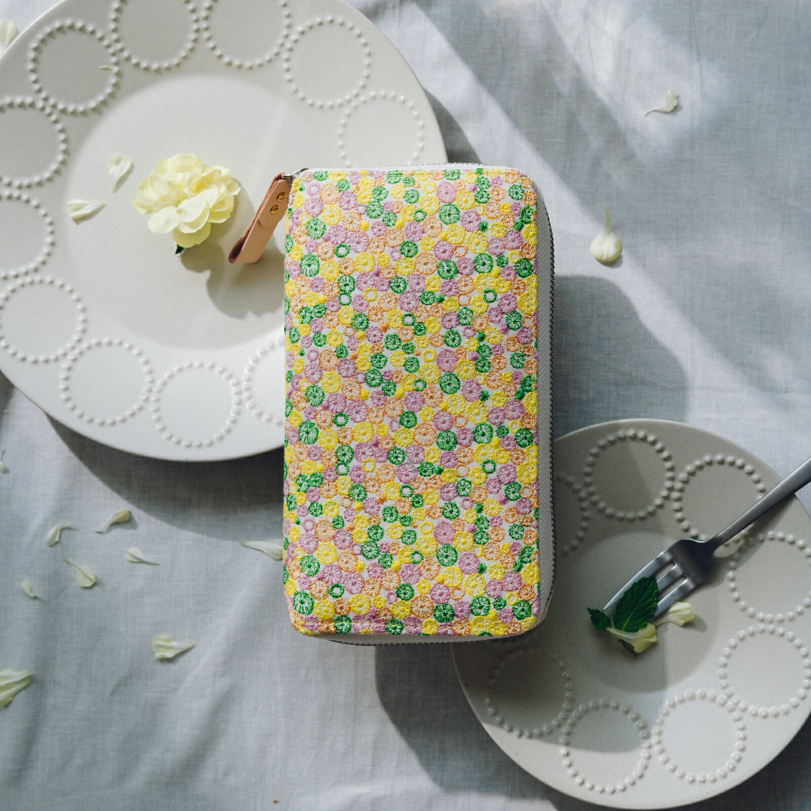 刺繍や染め、織りといったさまざまな技法で生地を作り、 長く大切に着られる服を手がけているブランド、 minä perhonen(ミナ ペルホネン)のweeksカバーです。 2014年にほぼ日手帳に登場し人気だった「skyful」で、 再び手帳カバーをつくりました。 今回はほぼ日手帳カバーのためにつくられた特別な配色。 空に瞬く満天の星をイメージした色とりどりのドットが、 ぱっと目をひく明るい配色で刺繍されています。 素材はやさしい肌触りのコットン。 刺繍糸には異なる2種の素材を使い、 凹凸とした刺繍の触り心地はもちろん、 光沢や質感の違いもたのしめます。 カバーの内側は鮮やかなイエロー。 ペンフックは、ペンのクリップ部分を とめられるタイプです。 ジッパーの引き手はヌメ革製で ちょうちょのカシメがついています。 穏やかな気持ちで日々持ち歩いていただけそうな、 あたたかな印象の手帳カバーです。 サイズ・仕様 サイズ 縦204mm×横115mm×厚さ30mm 重さ 約180g 主な素材 表側:綿・レーヨン・ポリエステル 内側:PU 知っておいてほしいこと■ミナ ペルホネンの店舗等ではお問い合わせを受け付けておりません ミナ ペルホネンのデザインディレクションのもと、株式会社ほぼ日が製造と販売を行っています。そのため、ミナ ペルホネンの店舗等ではこのカバーに関するお問い合わせをいっさい受けることができません。ほぼ日ストアまでお問い合わせください。 ■しおりのレース紐に糸のほつれが見られる場合があります カバーのしおりには、ミナ ペルホネンのオリジナルのレース紐を使用しており、糸のほつれが見られる場合があります。ほつれが気になる場合は無理に引っ張らず、糸の先を紐の編み目にさし込んでお使いください。 ■刺繍部分に少々の糸の飛び出しが見られる事がございます 刺繍部分に少々の糸の飛び出しが見られる事がございます。あらかじめご了承ください。 ■ペンフックのご使用について このカバーのペンフックは、ペンのクリップ部分を差し込んで使用するものです。ペンのサイズや形状によっては、ジッパーを開閉しづらくなることがあります。 ■摩擦や密着、水濡れなどにより色移りするおそれがあります 他のものとの摩擦や密着により色移りする場合があります。特に水や汗などで濡れた場合は、衣類や持ち物に色移りしやすくなるためご注意ください。 ■高温、多湿の場所を避けて保管してください 温度や湿度の高い場所に長時間置いておいたり、他のものと長時間密着させておくと、変質や色落ち、色移りが起こるおそれがあります。 類似商品はこちらほぼ日手帳 / 手帳カバー[スリム縦長] we14,300円ほぼ日手帳 / 手帳カバー[スリム縦長] we15,400円ほぼ日手帳 / 手帳カバー[スリム縦長] we5,940円