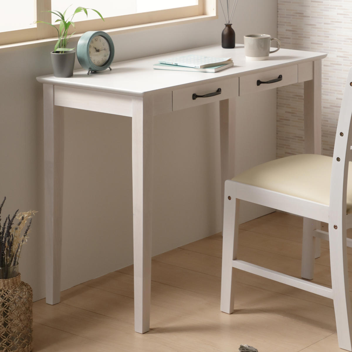フレンチカントリー&アンティーク調のかわいらしい雰囲気で、一人暮らしの女性に人気のリビング&ダイニンシリーズ「MIGNON」。 木目が美しいシャビーテイストが魅力的です。 【ホワイトウォッシュの美しい仕上げ】 アンティーク家具のような塗装の擦り減りを再現する仕上げを行いました。 木目を生かすことで天然木ならではの温かみが残り、 お部屋のインテリアとも調和しやすくなっています。 【こだわりのデザイン】 アンティーク感のある取っ手がワンポイント。 使い続けるうちに味が出てくる真鍮製です。 コンパクトなサイズですが、収納は十分。 A4サイズが入る引き出しが2杯付いていて、 文房具やタブレットを仕舞うことができます。 脚はテーパー脚と呼ばれる、先にいくにつれて 細くなる加工になっています。 通常の脚に比べ、すっきりとした印象になります。 天板に丸みを加えて柔らかい印象にしました。 お子様がいる家庭でも安心してお使いいただけます。 天板は奥行45cmのコンパクトなサイズなので、 ワンルームやリビングに置いても邪魔になりません。 サイズ:W900×D450×H710mm 引き出し内寸:W250×D315×H45mm 素材・成分:天板:天然木(ラバーウッド 18mm厚) 塗装、脚:天然木(ラバーウッド) 塗装 この商品は『組立品』です。 組立てはお客様にお願いしております。ご了承ください お届けが1週間程度かかる場合があります。 北海道・沖縄・離島は別途送料が必要となります。在庫更新のタイミングにより、在庫切れの場合はキャンセルさせていただく可能性が あります。 こちらの商品はメーカー直送品のため、プレゼント用ラッピングの出来ない商品となっております。
