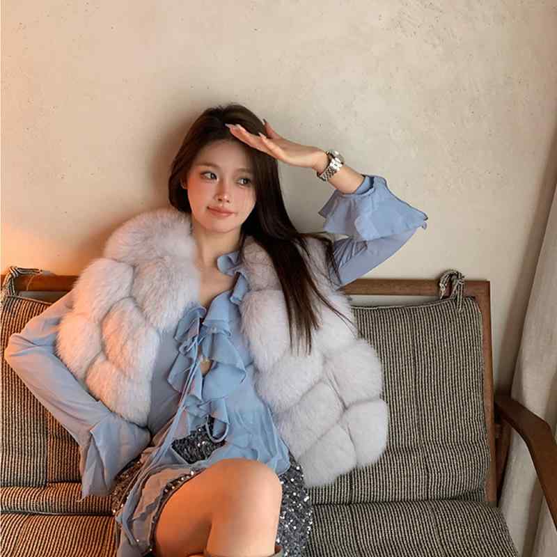 ベスト レディース 韓国風 フォックスファー 毛皮 アウター ショート丈 Vネック ノースリーブ 通勤 本革 白 ベージュ ピンク系