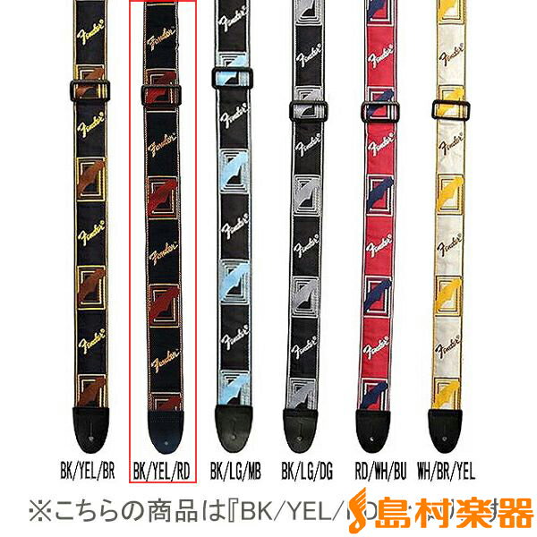 フェンダー・ストラップの代名詞といえるモノグラム・ストラップは、国内外を問わず多くのミュージシャンが愛用しています。 肩部の幅は2インチ(約5.08センチメートル)で、現在は肩の当たり心地を良くするためにパッドを少し厚めに改良されています。■自由に長さを調整できるので、ほとんどのプレイヤーにフィット(44〜52.5インチ) ■フェンダーロゴとヘッドストックの刺繍が入った不朽のデザイン ■裏地にポリエステルを使用し、舞台上でも舞台裏でもしっかりサポート ■先端がレザーで補強されているので、パフォーマンス中も安心 6種類のバリエーションがございます。 モデル番号 A,White/Brown/Yellow : 0990683000 B,Black/Light Grey/Dark Grey : 0990681543 C,Black/Yellow/Red : 0990681500 D,Black/Yellow/Brown : 0990681000 E,Red/White/Blue : 0990682000 F,Black/Light Grey/Blue : 0990681502