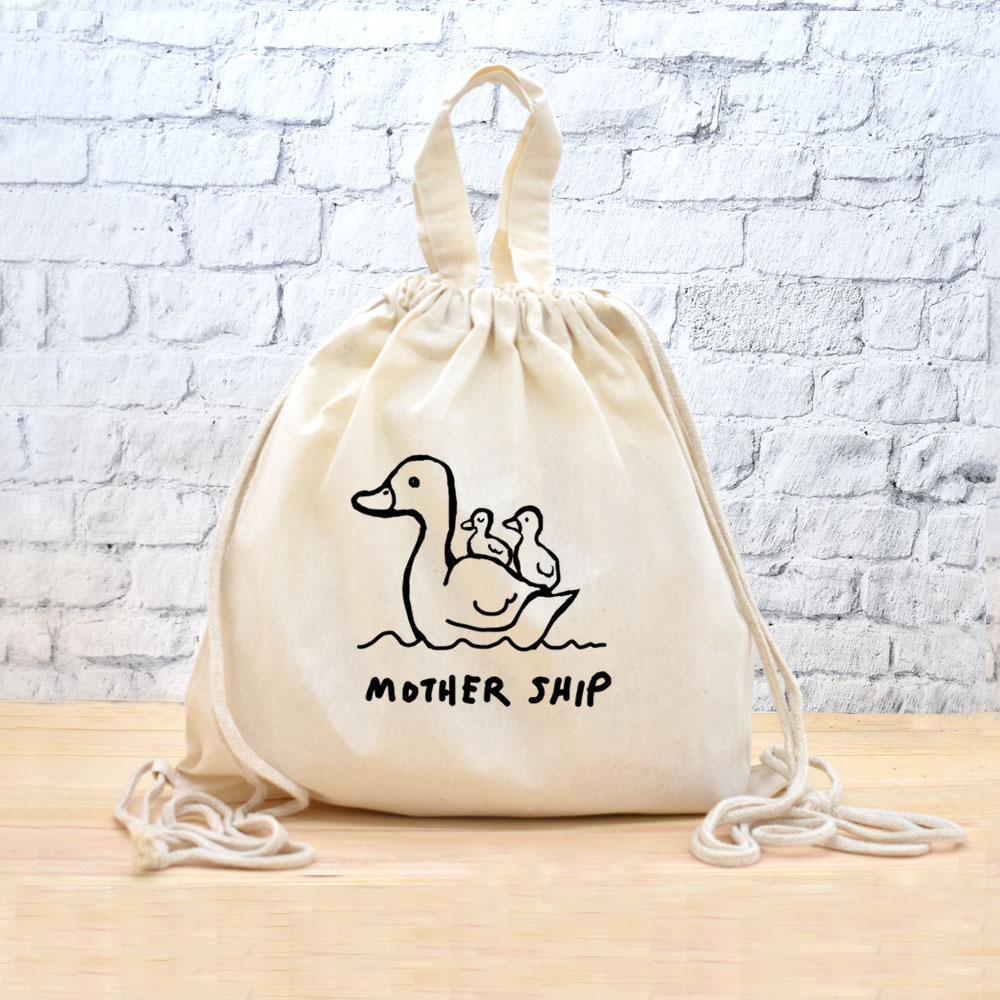 【即納 名入れ無し】 巾着袋 大 38×28cm MOTHERSHIP アヒル あひる 親子 ダック 鳥 動物 マザーシップ 母艦 空母 グッズ おもしろ 面白 おしゃれ ナチュラル オーガニックコットン 男の子 女の子 小学生 中学生 高校生 父の日 母の日 ブランド