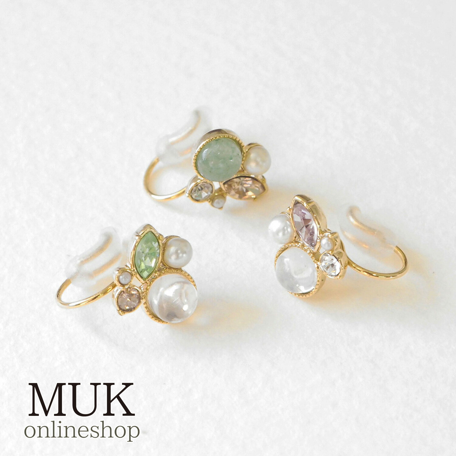 MUK Dreamy stone(エムユーケー ドリーミーストーン)シリーズ INFORMATION 願いを叶える天然石のお守りアクセサリー「MUK Dreamy stone(エムユーケードリーミーストーン)」に待望のイヤリングが登場♪ まんまる天然石とビジューやパールをたっぷりと並べた、キラキラ贅沢なピアス。柔らかな輝きが女性らしさをぐっと引き立てます。 ニッケルフリー金属アレルギーの原因の多くを占めると言われているニッケル。 ニッケルによって起こるアレルギーを防ぐことを目的に、ニッケルをほとんど含まない素材を使用したのがニッケルフリーアクセサリーです。 全ての方に金属アレルギー反応が出ない(アレルギーフリー)を保証するものではございません。予めご了承ください。 MUK Dreamy stone / ドリーミーストーン天然石の中でもジュエリーに使用される宝石《貴石・半貴石》を使用したオリジナルコレクション。 石にはそれぞれ古くから伝わる意味があり、持ち主をその運気に導くとされます。1つとして同じ石はないため、 自分のお気に入りを見つけお守りとして大切にお使いください。 SIZE H×W:約7×8mm MATERIAL 合金(ニッケルフリー)、クリスタル、プラスチックパール、天然石(ムーンストーン)(アベンチュリン)(ローズクォーツ)、シリコン樹脂 MADE IN JAPAN(日本製) ATTENTION 天然石は色味や濃淡、模様・内包物など1つ1つ個体差がある一点もの。微妙なニュアンスの違いをお楽しみいただけるアイテムです。あらかじめご了承の上お買い求めくださいませ。 関連ワード:アクセサリー アクセ ジュエリー 飾り ブランド 金属アレルギー対応 金属アレルギー 金アレ ニッケルフリー 低アレルゲン アレルギーフリー 痒くならない 痛くならない 安心 イヤリング 落ちない 落ちにくい 痛くない 痛くなりにくい 樹脂 ピアス風 軽い 小ぶり イアリング ノンホール ノンホールピアス 日本製 ニッケルフリー ピアス風イヤリング 樹脂 天然石 ナチュラルストーン お守り石 パワーストーン ストーン Dreamystone dreamy ブランド ドリーミーストーン 人気 流行 トレンド ニュアンス ファッション 上品 華やか 高見え 華奢 かわいい MUKoriginal 可愛い 大人かわいい おしゃれ フォーマル オフィスカジュアル デイリーユース MUK エムユーケー ギフト プレゼント イベント クリスマス バレンタイン ホワイトデー 母の日 敬老の日 ハロウィン 誕生日 記念日 七五三 成人式 入学式 入園式 卒業式 卒園式 結婚式 二次会 お呼ばれ 謝恩会 歓送迎会 退職祝い 就職祝い お礼 冠婚葬祭 パーティー 10代 20代 30代 40代 50代 女子 女性 男性 大人 子供 メンズ レディース キッズ 女の子 彼女 奥さん 妻 ポイント消化 プチプラ gems ※商品は生産ロットごとの個体差、製造、輸送時についた微細な キズ等が見られる場合がございます。商品画像の色味はフラッシュの加減やご利用の 端末画面の設定により、実際の色味と異なる場合がございます。また台紙、パッケージ デザインは予告なく変更となる場合がございます。予めご了承ください。▼天然石を使用したオリジナルコレクション