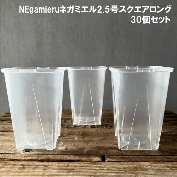 植物の根が健全に育つ!プラ鉢 深鉢 NEgamieruスリット鉢(透明):ネガミエル2.5号スクエアロング30個セット★NEgamieru ネガミエル2.5号スクエアロング×30個セット★ポトスで有名な生産者の浅岡園芸さんが考案した、人気の透明スリット鉢『NEgamieru ネガミエル』に2.5号スクエアロングです。挿し木や株分け苗の育成に最適です。透明なスリット鉢なので根の成長を見て楽しめる面白い鉢です。根と土の状態が目視できるため、水やりや植え替え等の管理がとても楽です。スリット鉢は、大地での根張りを鉢の中でも実現するためにデザインされた理想的な植木鉢です。根のサークリング現象を防止するので、用土の90%以上を有効利用することができ、植物の生育に大きな効果があります。果樹・野菜・観賞用などあらゆる園芸に最適です。※写真はイメージです。本商品は鉢のみです。土と植物は付属していません。色:透明形状:4角形サイズ:外径8cm、底径 5.8cm、高さ9cm容量:約0.18リットル特徴:・透明なスリット鉢のため、根の生育状況や土の水分状態など、目視で確認ができます。・植物にとって理想的な根張りを実現し、植物の成長を促します。・根が鉢底で旋回するサークリング現象を防止しますので、用土の90%以上が有効利用でき、植物の養分摂取効率を高めます。・独自設計のスリットにより、根を丈夫に保ちますので、栽培ロスを減らすことができます。・一般的には根詰まりを起こす前に鉢上げを行いますが、スリット鉢は根詰まりを極限にまで抑え、鉢上げの回数を最小限に減らすことが可能です。・スリット効果により、水の停滞をなくし水はけがよくなりますので、根腐れを起こすことが少なくなります。※写真はイメージです。お届けは鉢のみです。土と植物はつきません。