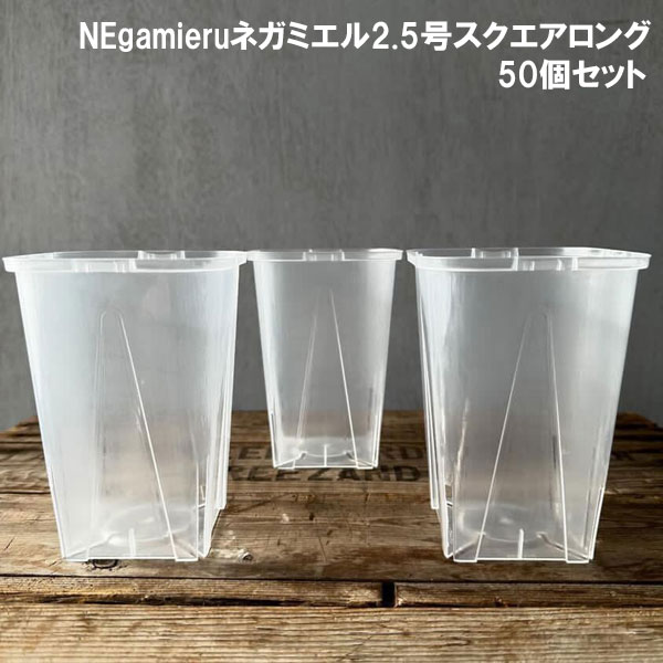 植物の根が健全に育つ!プラ鉢 深鉢 NEgamieruスリット鉢(透明):ネガミエル2.5号スクエアロング50個セット★NEgamieru ネガミエル2.5号スクエアロング×50個セット★ポトスで有名な生産者の浅岡園芸さんが考案した、人気の透明スリット鉢『NEgamieru ネガミエル』に2.5号スクエアロングです。挿し木や株分け苗の育成に最適です。透明なスリット鉢なので根の成長を見て楽しめる面白い鉢です。根と土の状態が目視できるため、水やりや植え替え等の管理がとても楽です。スリット鉢は、大地での根張りを鉢の中でも実現するためにデザインされた理想的な植木鉢です。根のサークリング現象を防止するので、用土の90%以上を有効利用することができ、植物の生育に大きな効果があります。果樹・野菜・観賞用などあらゆる園芸に最適です。※写真はイメージです。本商品は鉢のみです。土と植物は付属していません。色:透明形状:4角形サイズ:外径8cm、底径 5.8cm、高さ9cm容量:約0.18リットル特徴:・透明なスリット鉢のため、根の生育状況や土の水分状態など、目視で確認ができます。・植物にとって理想的な根張りを実現し、植物の成長を促します。・根が鉢底で旋回するサークリング現象を防止しますので、用土の90%以上が有効利用でき、植物の養分摂取効率を高めます。・独自設計のスリットにより、根を丈夫に保ちますので、栽培ロスを減らすことができます。・一般的には根詰まりを起こす前に鉢上げを行いますが、スリット鉢は根詰まりを極限にまで抑え、鉢上げの回数を最小限に減らすことが可能です。・スリット効果により、水の停滞をなくし水はけがよくなりますので、根腐れを起こすことが少なくなります。※写真はイメージです。お届けは鉢のみです。土と植物はつきません。