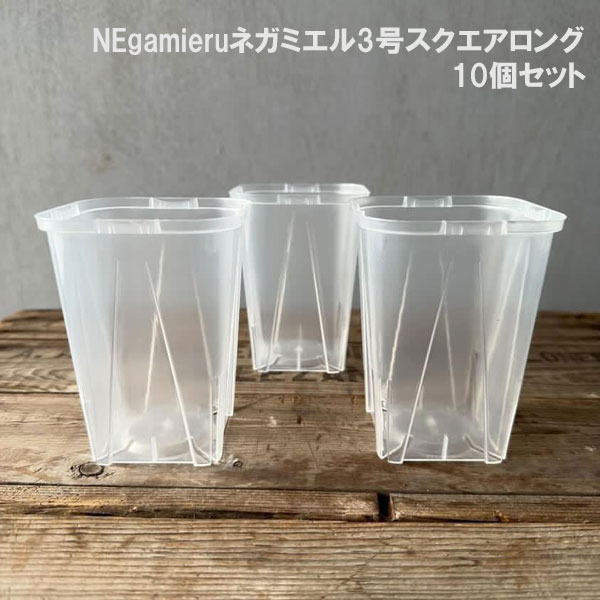 浅岡園芸 植物の根が健全に育つ! NEgamieruスリット鉢(透明):ネガミエル3号スクエアロング10個セット★NEgamieruネガミエル3号スクエアロング×10個セット★ポトスで有名な生産者の浅岡園芸さんが考案した、人気の透明スリット鉢『NEgamieru ネガミエル』に3号スクエアロングが登場です!2号から2.5号サイズの植え替えや、挿し木や株分け苗の育成におすすめです。透明なスリット鉢なので根の成長を見て楽しめる面白い鉢です。根と土の状態が目視できるため、水やりや植え替え等の管理がとても楽です。根に光が当たることでより生育が良くなる、樹上で生育する植物や気根(茎や幹から空気中に伸びる根)を出しながら木を這い登る植物(ポトスやアンスリウムなど)に適しています。スリット鉢は、大地での根張りを鉢の中でも実現するためにデザインされた理想的な植木鉢です。根のサークリング現象を防止するので、用土の90%以上を有効利用することができ、植物の生育に大きな効果があります。果樹・野菜・観賞用などあらゆる園芸に最適です。※写真はイメージです。本商品は鉢のみです。土と植物は付属していません。色:透明形状:4角形サイズ:外径9.4cm、底径 7.2cm、高さ10.5cm 容量:約0.41リットル特徴:・透明なスリット鉢のため、根の生育状況や土の水分状態など、目視で確認ができます。・植物にとって理想的な根張りを実現し、植物の成長を促します。・根が鉢底で旋回するサークリング現象を防止しますので、用土の90%以上が有効利用でき、植物の養分摂取効率を高めます。・独自設計のスリットにより、根を丈夫に保ちますので、栽培ロスを減らすことができます。・一般的には根詰まりを起こす前に鉢上げを行いますが、スリット鉢は根詰まりを極限にまで抑え、鉢上げの回数を最小限に減らすことが可能です。・スリット効果により、水の停滞をなくし水はけがよくなりますので、根腐れを起こすことが少なくなります。※写真はイメージです。お届けは鉢のみです。土と植物はつきません。