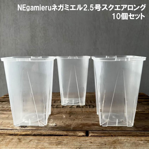 植物の根が健全に育つ!プラ鉢 NEgamieruスリット鉢(透明):ネガミエル2.5号スクエアロング 10個セットポトスで有名な生産者の浅岡園芸さんが考案した、人気の透明スリット鉢『NEgamieru ネガミエル』に2.5号スクエアロングです。挿し木や株分け苗の育成に最適です。透明なスリット鉢なので根の成長を見て楽しめる面白い鉢です。根と土の状態が目視できるため、水やりや植え替え等の管理がとても楽です。スリット鉢は、大地での根張りを鉢の中でも実現するためにデザインされた理想的な植木鉢です。根のサークリング現象を防止するので、用土の90%以上を有効利用することができ、植物の生育に大きな効果があります。果樹・野菜・観賞用などあらゆる園芸に最適です。※写真はイメージです。本商品は鉢のみです。土と植物は付属していません。色:透明形状:4角形サイズ:外径8cm、底径 5.8cm、高さ9cm容量:約0.18リットル特徴:・透明なスリット鉢のため、根の生育状況や土の水分状態など、目視で確認ができます。・植物にとって理想的な根張りを実現し、植物の成長を促します。・根が鉢底で旋回するサークリング現象を防止しますので、用土の90%以上が有効利用でき、植物の養分摂取効率を高めます。・独自設計のスリットにより、根を丈夫に保ちますので、栽培ロスを減らすことができます。・一般的には根詰まりを起こす前に鉢上げを行いますが、スリット鉢は根詰まりを極限にまで抑え、鉢上げの回数を最小限に減らすことが可能です。・スリット効果により、水の停滞をなくし水はけがよくなりますので、根腐れを起こすことが少なくなります。※写真はイメージです。お届けは鉢のみです。土と植物はつきません。