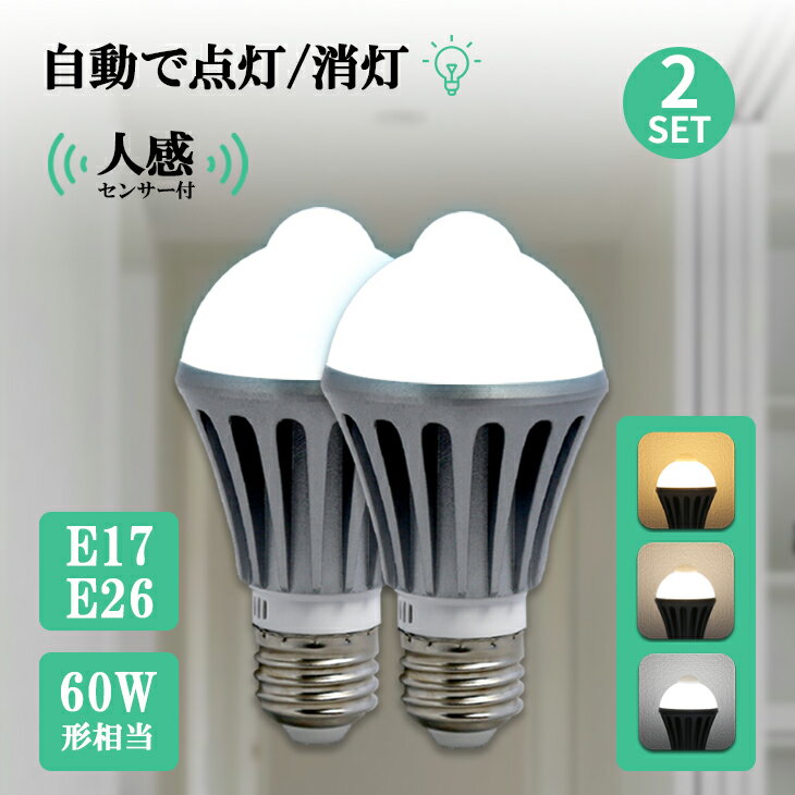 人感センサー ライト センサー E26 人感センサー LED電球 電球 2個セット ライト 電球 LED センサー 自動点灯消灯 人感センサー付きLED電球 E26 E17 60W形相当 センサーライト(MT-NGB2SET)