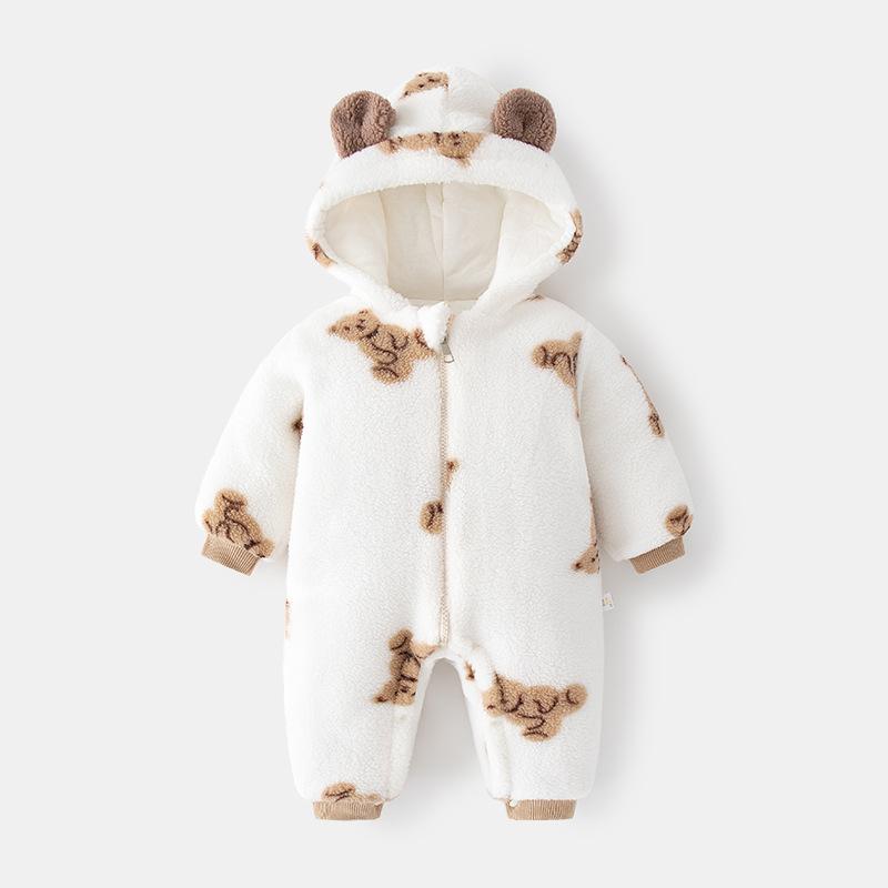 カバーオール ロンパース ベビー 赤ちゃん 男の子 女の子 男女兼用 秋冬 防寒 裏起毛 中綿入り 厚手 あったか フード付き ファスナー ジップアップ お出かけ 外出着 アウター サンゴフリース かわいい