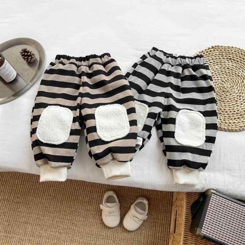 ベビーパンツ 女の子 男女兼用 秋冬 裏起毛 ストライプ柄 パッチワーク ジョガー スウェット コットン混 ボトムス グレー 厚手 暖かい 防寒 普段着 カジュアル