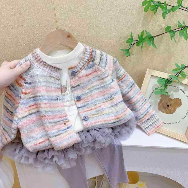 カーディガン 女の子 ベビー キッズ 韓国 かわいい おしゃれ ガーリー ニット トップス 長袖 前開き ボタン付き ボーダー柄 カラフル 柔らかい ポリエステル素材 秋冬 デイリーユース