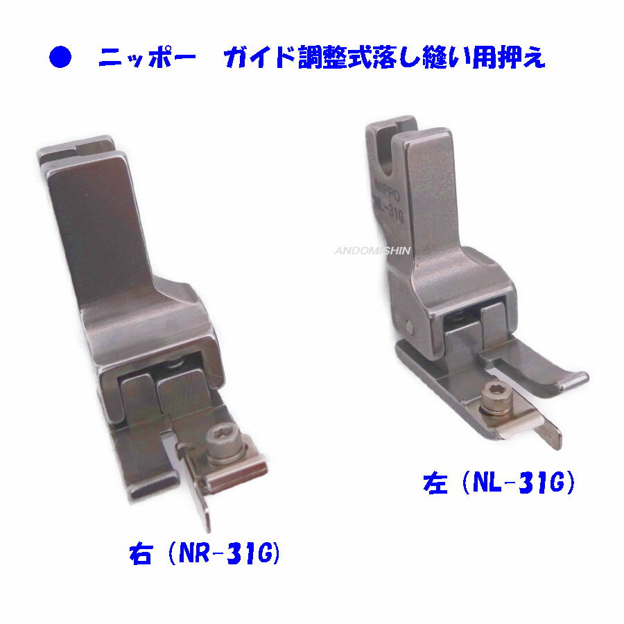 押えの先端部分にガイドが付いていますので、スカート・スラックス・ズボンなどの落し縫う作業に便利なおとし用押さえです。 生地の厚みなどによってガイド部分は、若干ですが左右に調整ができます。 (調整に必要な六角レンチは、付属品でついています) ニッポー ガイド付落とし縫い用押えには、右ガイドと左ガイドの2種類があります。 縫う製品のデザインによって、お選びください。 ガイドが右側と左側があるため比べやすいように1つの画像に2個の押さえが掲載していますが、記載している販売価格は、1個の価格になります。 型番:左ガイド(NL-31G) / 右ガイド(NR-31G) 製造メーカー:ニッポー(日邦ミシン株式会社) 落し縫い用アタッチメントの一覧表は、下記のアドレスに掲載しています。 https://item.rakuten.co.jp/andomishin/c/0000000397/