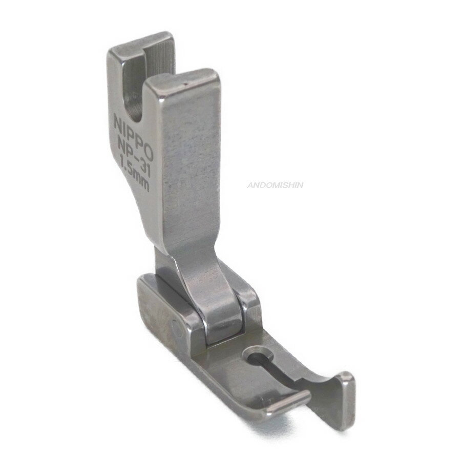 ● ニッポー 右爪付自由押さえ(1.5ミリ) 品番:NP-31 ガイド部分が固定している右側にガイド(爪)がついているステッチ用の押え金です。 *押えの前後長さ:28ミリ 既製品の服などを見ると、1mmや2mmなど細い幅の ステッチが綺麗に縫ってありますが、これらは目視で 縫うと幅がずれてしまうため、通常は写真のような ステッチ押え(または段付押えとも言います)で縫います。 1cm以上の広い幅のステッチを縫う時に使用する、 押え棒に取り付けるステッチ定規やマグネット定規が 簡単にステッチ幅を調整できますが、1センチ以下の 細かい寸法を縫うステッチ押えを使用したほうが 綺麗に縫いあがります。 注意 ステッチ押え(段付き押え)は、寸法によって押え金を 交換する必要があります。 また、ステッチ押えには右用と左用があります。 通常は、右用がよく使用されます。よく、コバステッチと いいますが、コバステッチは1.5mmくらいの幅の ことを言います。 この商品は、職業用ミシン・工業用ミシン (一部の特殊ミシンを除く)用の商品になります。 家庭用ミシンには、取り付けることが出来ませんので ご注意ください。 その他の寸法の「爪付自由押え」は、下記のアドレスに掲載しています。 https://item.rakuten.co.jp/andomishin/c/0000000326/ その他の形状のステッチ用の押さえは、下記のアドレスに掲載しています。 https://item.rakuten.co.jp/andomishin/c/0000000229/
