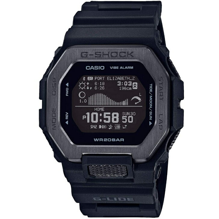 世界のトップサーファーから支持を受けるG-SHOCKのスポーツラインG-LIDE。スマートフォン連携機能を搭載したGBX-100のナイトサーフィンをイメージしたカラーです。このモデルは潮汐情報や日の出/日の入時間を、専用アプリ内の世界約3300カ所から簡単に時計側に設定できます※。また、高精細なMIP液晶で視認性を向上。タイドグラフ、ムーンデータに加え、満潮/干潮時間、満潮/干潮の潮位、日の出/日の入時間が表示可能。これにより一目で現在の状況を把握でき、トレーニング計測機能と合わせてサーファーを手元からサポートします。ベゼルは樹脂とメタルを組み合わせて構成し、ブラックIPを施しました。ベゼルのトップ部分はステンレスを用い、ヘアラインとホーニング加工により強度と質感を両立。また、上下左右からの衝撃に耐えられる樹脂のガード構造を用い、6時位置のボタンガードと共に耐衝撃性能を備えました。バンドには、6時位置の根元部分にフィット性と水、汗逃げを考慮したスリットが入ったソフトウレタンバンドを採用し着け心地を追求。ナイトサーフィンをイメージしたダークトーンでクールな仕上がりのG-LIDEです。※表示される潮汐情報は過去のデータをもとに計算しているため、誤差が生じます。あくまで目安としてお使いください。【基本情報】ケースサイズ(縦×横×厚さ):50.9 × 46 × 14.7 mm質量:66 gケース・ベゼル材質:樹脂/ステンレススチールバンド:樹脂バンド構造:耐衝撃構造(ショックレジスト)防水性:20気圧防水使用電源・電池寿命:電池寿命:約2年センサー機能:トレーニング機能:加速度センサーによる距離・速度・ペースなどを計算して表示、自動/手動ラップ機能、オートポーズ機能、到達お知らせアラート設定(時間、消費カロリー)ON/OFF切替機能、トレーニング表示カスタマイズ機能(計測タイム、距離、ペース、ラップタイム、ラップ距離、ラップペース、平均ペース、速度、平均速度、消費カロリー)【モバイルリンク/アプリ連携機能】モバイルリンク機能:モバイルリンク機能(Automatic Connection、対応携帯電話とのBluetooth? 通信による機能連動)アプリ:「G-SHOCK MOVE」対応【外装】ガラス:無機ガラス表面加工:ブラックIP(ケース部)バンド装着可能サイズ:145~215mm【時計機能】■ワールドタイムワールドタイム:世界38都市(38タイムゾーン※、サマータイム自動設定機能付き)+UTC(協定世界時)の時刻表示※ スマートフォンとの連携により更新される場合があります。■ムーンデータムーンデータ(月齢・月の形表示)■タイドグラフタイドグラフ(潮回り:3段階表示)■日の出・日の入時刻表示日の出日の入時刻表示:プリセットされた世界50ポイント+ユーザー設定による任意のポイントから選択可能■ストップウオッチストップウオッチ(1秒、100時間計、スプリット付き)■タイマータイマー:最大5つの時間設定が可能なインターバル計測用のタイマー(セット単位:1秒、最大セット:60分、1秒単位で計測、オートリピート)■アラーム/時報時刻アラーム4本(スヌーズ機能付き)■ライトLEDバックライト(オートライト、スーパーイルミネーター、残照機能、残照時間切替(1.5秒/3秒)付き)■ライトカラーLED:ホワイト■カレンダーフルオートカレンダー■操作音ON/OFF切替機能操作音ON/OFF切替機能■パワーセービング機能パワーセービング機能(毎日一定時間になると表示を消して節電します)■精度※スマートフォンと連携しない場合は、通常のクオーツ精度(平均月差±15秒)で動作します。■その他機能12/24時間制表示切替機内モード日付・曜日表示ユーザープロフィール設定機能バイブレーション機能操作バイブレーションON/OFF切替機能■センサー機能詳細トレーニングログデータ(最大100走分、ラップデータはそれぞれ最大140本)、計測タイム、距離、ペース、消費カロリーライフログデータ:<デイリーデータ表示>歩数、<月間データ表示>走行距離【02305000000000000】【03002261200000000】