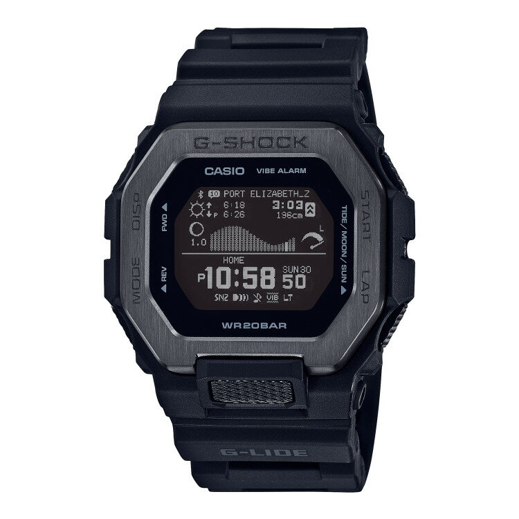ケース/ベゼル材質 樹脂/ステンレススチール 樹脂バンド 耐衝撃構造(ショックレジスト) 無機ガラス ブラックIP(ベゼル部) 20気圧防水 トレーニング機能 表示カスタマイズ(計測タイム、距離、ペース、ラップタイム、ラップ距離、ラップペース、平均ペース、速度、平均速度、消費カロリー) トレーニングログデータ(最大100走分、ラップデータはそれぞれ最大140本) 計測タイム、距離、ペース、消費カロリー ライフログデータ <デイリーデータ表示>歩数、<月間データ表示>走行距離 ユーザープロフィール設定機能 タイドグラフ(潮回り 3段階表示) ムーンデータ(月齢/月の形表示) 日の出日の入時刻表示 モバイルリンク バイブレーション機能 ワールドタイム ストップウオッチ タイマー 時刻アラーム4本(スヌーズ機能付き) パワーセービング機能 日付/曜日表示 フルオートカレンダー 12/24時間制表示切替 機内モード 操作音ON/OFF切替機能 操作バイブレーションON/OFF切替機能 LEDライト 電池寿命 約2年 サイズ(H×W×D) 50.9×46×14.7mm 質量 66g世界のトップサーファーから支持を受けるG-SHOCKのスポーツラインG-LIDE スマートフォン連携機能を搭載したGBX-100のナイトサーフィンをイメージしたダークトーンカラー このモデルはサーファーが必要とする潮汐情報や日の出/日の入時間を、専用アプリケーションに内蔵されている世界約3300カ所から選択し簡単に時計側に設定することができます。 ワイドフェイスで高精細なMIP(メモリインピクセル)液晶を採用することで視認性を高め、従来のモデルのタイドグラフ、ムーンデータ表示に加え、満潮/干潮時間、満潮/干潮の潮位、日の出/日の入時間を表示することが可能になりました。これにより一目で現在の状況を詳細に把握できるようにしました。 トレーニング計測機能(距離、速度、ペース、ラップ、ピッチ計測)と合わせて、世界を飛び回りタフに戦い抜くサーファーを手元からサポートします。 ベゼルは樹脂とメタルを組み合わせて構成し、ブラックIP(1JF)、ゴールドIP(4JF)を施しました。ベゼルのトップ部分はステンレスパーツを用い、ヘアラインとホーニング加工を施した仕上げ分けで強度と質感を両立したデザインに仕上げています。 姿勢が安定しない環境を想定し、上下左右からの衝撃に耐えられる樹脂のガード構造を用い、6時位置のボタンガードと共にG-SHOCKならではの耐衝撃性能を備えました。バンドには、6時位置の根元部分にフィット性と水、汗逃げを考慮したスリットが入ったソフトウレタンバンドを採用し、着け心地を追求しました。