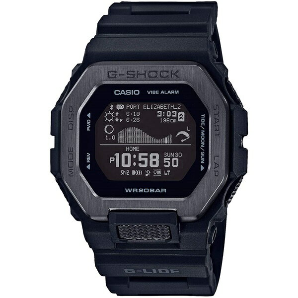 [当店5年間保証対象]G-SHOCK GBX-100NS-1JF G-LIDE スマートフォンリンク デジタル 腕時計 ブラック Gショック ジーショック Gライド ジーライド CASIO カシオ 国内正規モデル世界のトップサーファーから支持を受けるG-SHOCKのスポーツラインG-LIDE。スマートフォン連携機能を搭載したGBX-100のナイトサーフィンをイメージしたカラーです。このモデルはサーファーが必要とする潮汐情報や日の出/日の入時間を、専用アプリケーションに内蔵されている世界約3,300カ所から選択し簡単に時計側に設定することができます。また、ワイドフェイスで高精細なMIP(メモリインピクセル)液晶を採用することで視認性を高め、従来のモデルのタイドグラフ、ムーンデータ表示に加え、満潮/干潮時間、満潮/干潮の潮位、日の出/日の入時間を表示することが可能になりました。これにより一目で現在の状況を詳細に把握できるようにしました。トレーニング計測機能(距離、速度、ペース、ラップ、ピッチ計測)と合わせて、世界を飛び回りタフに戦い抜くサーファーを手元からサポートします。ベゼルは樹脂とメタルを組み合わせて構成し、ブラックIP(1JF)、ゴールドIP(4JF)を施しました。ベゼルのトップ部分はステンレスパーツを用い、ヘアラインとホーニング加工を施した仕上げ分けで強度と質感を両立したデザインに仕上げています。また姿勢が安定しない環境を想定し、上下左右からの衝撃に耐えられる樹脂のガード構造を用い、6時位置のボタンガードと共にG-SHOCKならではの耐衝撃性能を備えました。バンドには、6時位置の根元部分にフィット性と水、汗逃げを考慮したスリットが入ったソフトウレタンバンドを採用し、着け心地を追求しました。ナイトサーフィンをイメージしたダークトーンでクールな仕上がりのG-LIDEです。仕様/素材ケース・ベゼル材質: 樹脂/ステンレススチール樹脂バンド耐衝撃構造(ショックレジスト)無機ガラスブラックIP(ベゼル部)20気圧防水トレーニング機能:加速度センサーによる距離・速度・ペースなどを計算して表示、自動/手動ラップ機能、オートポーズ機能、到達お知らせアラート設定(時間、消費カロリー)ON/OFF切替機能、トレーニング表示カスタマイズ機能(計測タイム、距離、ペース、ラップタイム、ラップ距離、ラップペース、平均ペース、速度、平均速度、消費カロリー)トレーニングログデータ(最大100走分、ラップデータはそれぞれ最大140本):計測タイム、距離、ペース、消費カロリーライフログデータ:<デイリーデータ表示>歩数、<月間データ表示>走行距離ユーザープロフィール設定機能タイドグラフ(潮回り:3段階表示)ムーンデータ(月齢・月の形表示)日の出日の入時刻表示:プリセットされた世界50ポイント+ユーザー設定による任意のポイントから選択可能モバイルリンク機能(対応携帯電話とのBluetoothR通信による機能連動)バイブレーション機能ワールドタイム:世界38都市(38タイムゾーン※、サマータイム自動設定機能付き)+UTC(協定世界時)の時刻表示※ スマートフォンとの連携により更新される場合があります。ストップウオッチ(1秒、100時間計、スプリット付き)タイマー:最大5つの時間設定が可能なインターバル計測用のタイマー(セット単位:1秒、最大セット:60分、1秒単位で計測、オートリピート、オートスタート)時刻アラーム4本(スヌーズ機能付き)パワーセービング機能(毎日一定時間になると表示を消して節電します)日付・曜日表示フルオートカレンダー12/24時間制表示切替機内モード操作音ON/OFF切替機能操作バイブレーションON/OFF切替機能LEDライト(オートライト、スーパーイルミネーター、残照機能、残照時間切替(1.5秒/3秒)付き)電池寿命:約2年※ スマートフォンと連携しない場合は、通常のクオーツ精度(平均月差±15秒)で動作します。サイズサイズ(H×W×D) : 50.9×46×14.7mm質量 : 66g付属品/保証・箱・説明書兼保証書・メーカー1年保証