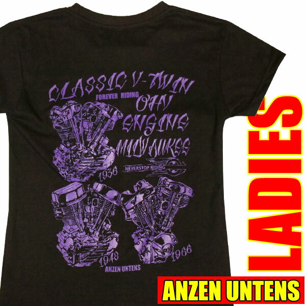 【S】【M】レディース アメカジ バイカーTシャツ【クラシックVツイン 黒】(半袖Tシャツ)ANZEN UNTENS・アンゼンウンテンズ エンジン パンヘッド ナックルヘッド ショベルヘッド 綿 ハーレー アメリカン 安全運転 バックプリント バイク女子 バイカー女子