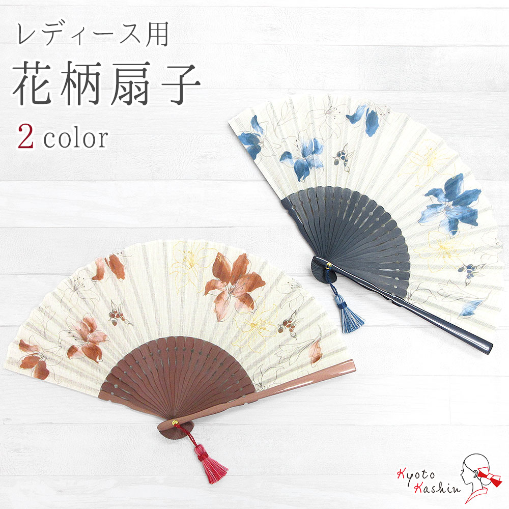 扇子 レディース ラフィネ 袋付き 女性用 花柄扇子 おしゃれ ギフト プレゼント 母の日 敬老の日 / 水彩 刺繍 パール塗 タッセル 房 綿 / 赤 青 花 / かわいい 涼 雑貨 夏小物 浴衣 夏祭り 箱入り