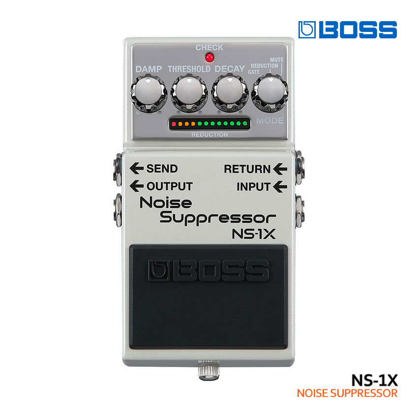 BOSS 独自のMDP 技術により完成した次世代のノイズ・リダクションと超高速ゲートNS-1X は、BOSS 独自のデジタル信号処理技術MDP を駆使した多元的かつ高速な信号処理により、原音のアタックやサスティン、弾き心地を損なわずにノイズを取り除く次世代のノイズ・サプレッサーです。極めて自然にノイズを除去する汎用性の高いREDUCTION モードと、圧倒的な速さでゲートを動作させ、ハイゲイン・サウンドによるリフ・プレイやタッピング、スウィープ などテクニカルな奏法に最適な効果をもたらすGATE モードを搭載。NS-1X は悩ましいノイズの問題を取り除くだけでなく、新しい演奏表現をギタリスト/ベーシストへもたらす高度なノイズ・サプレッサーです。・BOSS 独自のMDP 技術を駆使した次世代のノイズ・サプレッサー・高度な信号処理により、ギター本来の音色や弾き心地への影響なくノイズを抑制・3 つのノブで目的にあった設定が可能・自然な弾き心地のままノイズを抑制する汎用性の高いREDUCTION モード・ハイゲイン・サウンドでのリフやテクニカルな奏法に最適な、極めて高速なゲート処理を実現するGATE モード・全信号のミュートとノイズ・リダクションの使い分けが可能なMUTE モード・ノイズ・リダクションのかかり具合を視覚的に表示するインジケーター・歪みペダルのノイズ抑制に最適なSEND/RETURN 端子・ギターやベース、その他電子楽器での使用が可能・ 他ペダルへの電源供給(9V) が可能なDC OUT を搭載・安心の長期5 年保証次世代のノイズ・サプレッサーノイズ・サプレッサーは、一定以下の入力信号を遮断することで、休符時などの楽器が鳴っていない時に目立つノイズを除去するエフェクトです。快適な演奏環境を提供する一方、入力される信号に対し常にゲートの開け閉めを繰り返すため、しばしば原音のアタックが失われたり、サスティンが不自然になったりすることも少なくありません。NS-1XはBOSS独自のMDPテクノロジーを駆使して開発された高度なノイズ・サプレッサーです。入力信号のレベル、立ち上がりや減衰の時間経過による変化など、膨大な情報を最新のデジタル技術を用いて処理することで、レスポンスを損なうことなく高速ノイズ除去を実現します。理想的なノイズ・リダクションを実現NS-1XはREDUCTION、GATE、MUTEモードを搭載しています。プレイ・スタイルや好みに応じて選択することで、適切な効果を得ることが可能です。REDUCTION—汎用性の高いモードです。どのようなサウンド、奏法でも弾き心地はそのままに、不要なノイズのみを自然に取り除きます。出力の弱いピックアップでも、音が不自然に揺れることなくロング・ノートを演奏可能です。GATE—超高速でゲートの開閉をコントロールするモードです。極めて鋭いアタックを保ちつつ、演奏を止めれば即座に静寂を得ることが可能です。深く歪ませたサウンドによるキレを重視したリフ・プレイや、輪郭あるアタックが必要なスラップ、タッピングを駆使した奏法など、モダンなスタイルに最適です。MUTE—エフェクトをオンにしている間、全ての信号を遮断するモードです。エフェクト・バイパス時はREDUCTIONおよびGATEモードでノイズ・リダクション効果が得られます。迅速かつ簡単な操作NS-1Xは3つのパラメーターを搭載しています。使用機材、演奏スタイルや環境に合わせて設定を行うことで、原音のキャラクターや弾き心地を損なうことなくノイズを除去することが可能です。また、リダクション・インジケーターが除去したノイズ・レベルをリアルタイムで表示するため、実際のノイズ・リダクションのかかり具合を細かく視認することもできます。THRESHOLD—ノイズ・リダクションを開始する信号レベルを調節するノブです。REDUCTIONモードでは、左に回し切った状態から設定を開始し、ノイズが聞こえなくなるまでノブを右に回します。GATEモードを用いる際は、右に回し切った状態から、ピッキングした際に音が出るようになるまで左に回していくと、鋭いアタックとタイトなリリースを得ることが可能です。DECAY—ノイズ・リダクションが開始する際の音の減衰時間を調節するノブです。右に回すほど減衰時間が長くなります。始めはノブを左に回し切り、音の切れぎわが不自然な場合は徐々に右へ回していくことでスムーズな減衰へと調整可能です。DAMP—ノイズ・リダクションによるノイズの減衰量を調節するノブです。右に回すと演奏時と無音時の差が明確に、左に回すとなめらかになります。メリハリのある無音時間を作りたいときは右に、ピッキングニュアンスを活かした繊細な演奏をする際は左に回すと効果的です。スマートにノイズを抑制NS-1XはINPUTにギターの信号が入力されると演奏状態を解析。この検出を元に、瞬時にOUTPUTに配置されているゲートの開閉を指示し、ノイズを適切に抑制します。歪みペダルのノイズを抑制したい場合は、ペダルをNS-1XのSEND/RETURNに取り込みます。検出に好ましいクリーン・サウンドをINPUT段