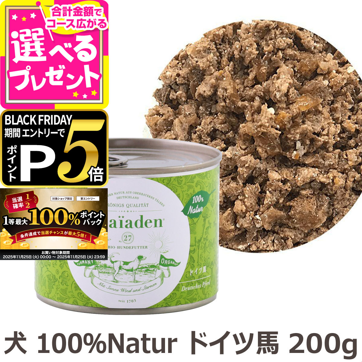 【お一人様一度のご注文につき、おまけは一点限りとさせて頂きます】 大自然で放牧されたドイツ産馬肉95%。低脂肪、高タンパクな愛犬のエネルギー源。 自然豊かなバイエルンで放牧された新鮮な馬肉を95%使用。低脂肪、高タンパクで、エネルギー源になるグリコーゲン、鉄分やカルシウムを豊富に含む滋養満点の食材です。ビタミンやミネラル、食物繊維に富んだスーパーフード・キヌアを配合。バイエルンの豊かな自然の中でう育まれ、 旨みと栄養をたっぷり蓄えた豊潤な恵み。 100%Naturウェットフード ドイツ馬 大自然で放牧されたドイツ産馬肉95%。 低脂肪、高タンパクな愛犬のエネルギー源。 自然豊かなバイエルンで放牧された新鮮な馬肉を95%使用。 低脂肪・低カロリーでありながら、エネルギー源になるグリコーゲン、鉄分・カルシウムが豊富で滋養満点です。 ビタミンやミネラル、食物繊維に富んだスーパーフード・キヌアを配合。 アレルギーの原因となるグルテンが含まれていないことを示しています。 【対象】全犬種用、オールステージ ■高品質原材料 ホース 47.5%、ホースその他の部位 47.5%(肝臓、肺)、キヌア 2%、ニンジン 2%、ヒマワリ油 0.5%、有機キクイモ 0.5% 肉と臓器の含有率95%以上 ■成分分析値 粗タンパク質 11.2%、粗油脂 6.5%、粗繊維 0.7%、 粗灰分 1.5%、水分 79.1% ■ミネラル分析値 カルシウム 0.32%、リン 0.24% ■カロリー 125kcal(100gあたり) ■恵まれた自然環境が生んだ100%ドイツ産の食材 果てしなく広がる森林と広大な草原。山麓の雪どけ水を湛えた湖や、清らかな渓流…。 手つかずの自然が残り、いきものたちにとって理想的な環境である南ドイツ・アッパーバイエルン州。 この豊かな大地で育まれたドイツ産の天然素材のみを使用したウェットフードです。 「100%Natur」シリーズは、野生に近い自然環境でのびのび育てた動物や魚介を、 脂がのった最高の状態で調理。 旨みと栄養をたっぷり蓄えた素材の持ち味を大切にした、贅沢なごちそうです。 ■添加物に頼らず実現した芳醇な味わい 人工香料や合成調味料に頼らないフードでありながら、蓋を開けた瞬間に立ちのぼる芳しい肉の香り。 愛犬の食欲を刺激するこの香りは、300年以上の伝統で培われた独自の調理法に秘密があります。 人も口にできる新鮮な肉を厳選し、繊維を断ち切らず塊のまま残すことで、 肉本来の風味や歯ごたえを生かしているのです。 さらに、栄養価の高い内臓も一緒に調理し、愛犬の狩猟本能をかきたてる味わいに仕上げています。 ■スーパーフード「キヌア」を配合 食材が持つパワーを無駄なく愛犬のからだへ届けるために、 消化吸収を助ける栄養素をバランスよくミックスしています。 タンパク質やビタミン・ミネラル、食物繊維に富んだスーパーフード「キヌア」、 水溶性食物繊維のイヌリンが豊富な「キクイモ」を配合。 キヌアはグルテンフリーのため、食物アレルギーの愛犬でも安心です。 総合栄養食なので主食として与えられます。 ■専従獣医が監修して開発・製造しています。 プレイアーデンのペットフードは、ペット先進国ドイツの専従獣医による監修のもと開発・製造を行っています。 オラフ・テュルク氏は、ドイツで300年以上の歴史を誇る老舗ペットフードメーカーに従事し、 専門知識と技術を磨きあげた獣医学のスペシャリストです。 ■寄付について プレイアーデンでは、「公益財団法人 日本補助犬協会」の賛助会員として、売上の一部を寄付しています。 この協会は、日本で唯一3種類(盲導犬・介助犬・聴導犬)すべての補助犬を育成および認定できる法人として、内閣府に認められています。 公益財団法人 日本補助犬協会(内閣府公益認定法人、国家公安委員会指定法人、厚生労働省 指定法人) ■こだわりの食材 愛犬の成長や免疫機能に欠かせない必須アミノ酸をすべて含んでいる動物性タンパク質は、犬にとって最も大切な栄養素。 消化吸収に優れているのも特徴です。 プレイアーデンでは、無農薬の有機飼料で育てたBio肉や、ヒューマングレードの新鮮な肉類を厳選しています。 動物の被毛やひづめといった肉の副産物は一切含んでいません。 キク科の多年草で、肥大した根の部分(イモ)を食用とします。 デンプンを主体とするジャガイモとは異なり、 主成分はイヌリン*1という水溶性の食物繊維。 イヌリンは、腸内の乳酸菌やビフィズス菌などの善玉菌を増やし、 腸内環境を整える優秀なプレバイオティクス*2です。 愛犬たちの消化力や免疫力の向上、便秘改善に効果を発揮します。 *1 キクイモやごぼう、ニラなどに多く含まれる多糖類の一種で、水溶性食物繊維。 消化されずに腸まで届き、善玉菌を増やして腸内環境を整えます。 *2 プロバイオティクスの働きを助ける物質のこと。 消化過程で分解・吸収されず、 腸内のプロバイオティクスのエサになり、善玉菌だけを増やします。 白米と比べてタンパク質は2倍、オレイン酸を中心とした脂質は5倍、 食物繊維は8倍と、栄養