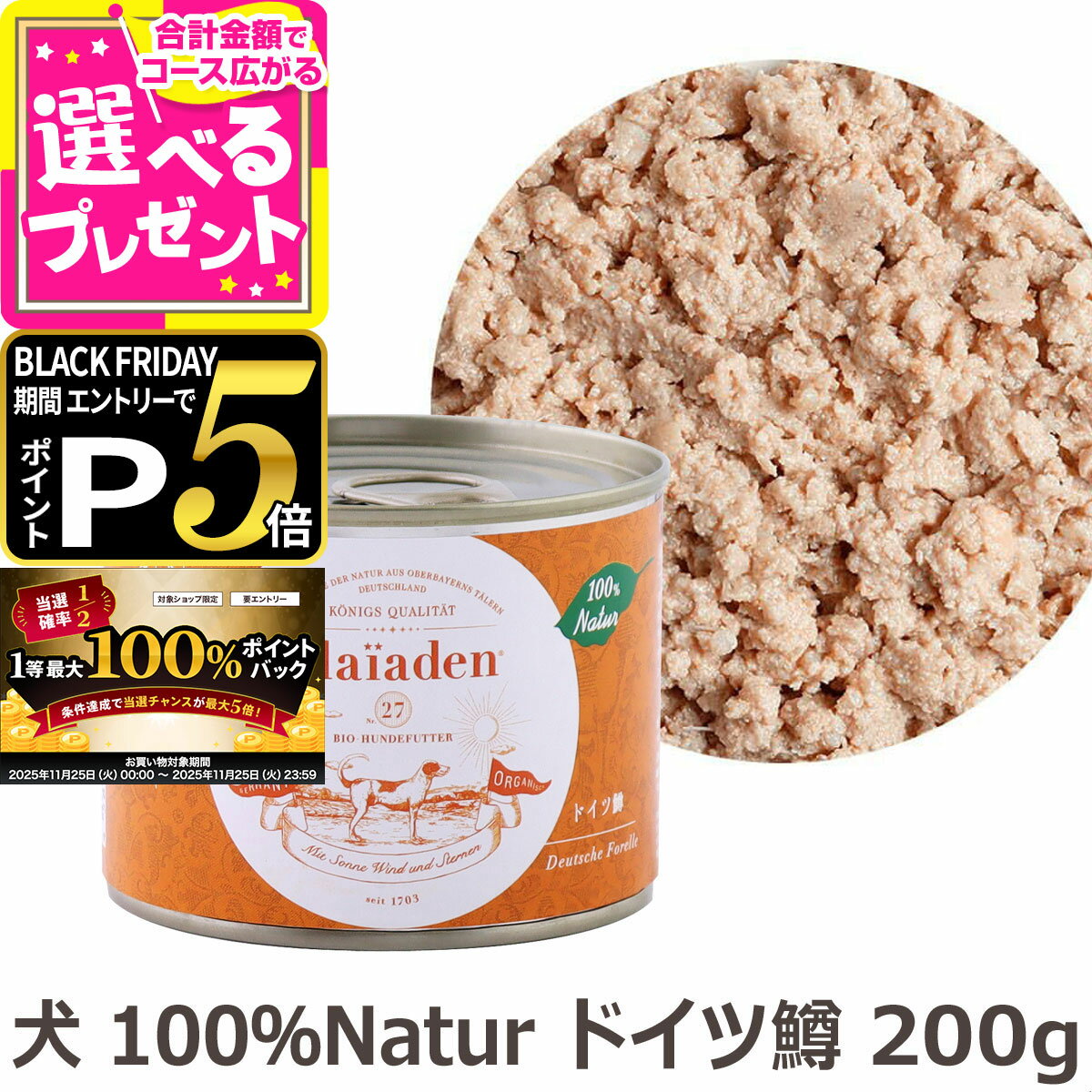 ■ 特徴 【200g×12缶・全5種類から選べる】 プレイアーデン 犬用ウェットフード ※同じ商品12缶のお届け 【100%有機 ドイツ牛】 有機飼料で育てたドイツ牛95%使用。 芳しい香りが立ち上る贅沢な味わい。 牛肉は吸収率に優れたヘム鉄や亜鉛などミネラルの宝庫。 自然豊かなバイエルンで、無農薬の有機飼料を与えて放牧された牛肉を95%使用。 人が口にできる新鮮な食材を厳選した贅沢な味わいです。 【100%有機 ドイツ豚】 ドイツ産BIO豚肉94%使用 スタミナ不足を補うビタミンB1たっぷり。 自然豊かなバイエルンで、無農薬の有機飼料を与えて放牧された豚肉を94%使用。 人が口にできる新鮮な食材を厳選した贅沢な味わいです。 豚肉は健康維持をサポートするビタミンB1が豊富。 【100%有機 チキン】 有機飼料で育てたドイツ産BIO鶏肉95%使用。 キビやキクイモを加えて栄養価アップ! 自然豊かなバイエルンで、無農薬の有機飼料を与えて平飼いされた鶏肉を95%使用。 人が口にできる新鮮な食材を厳選した贅沢な味わいです。 鶏肉は目や皮膚の健康を守るビタミンAが豊富。 【100%Wild 贅沢ジビエ 野うさぎ】 バイエルンの野山を駆けて育った天然の恵み 滋養に満ちた愛犬のためのジビエ 低脂肪・低カロリーで栄養豊富なヘルシー食材 野生のウサギ肉95%使用 良質なタンパク質が愛犬のからだを支える毎日のメインディッシュ バイエルンの野山を駆けて育った新鮮なうさぎ肉を95%使用。 低脂肪でヘルシーな野生のうさぎ肉は、皮膚・粘膜の健康を守るナイアシン、造血に必要なビタミン12が豊富です。 【100%Natur ドイツ鱒】 大自然で育まれたドイツ産トラウト98.5%使用。 キヌアを加えて栄養バランスアップ。 アレルギーが心配な愛犬にもごちそうを。 自然豊かなバイエルンで育まれた新鮮なトラウトを98.5%使用。 良質なタンパク質や皮膚・被毛の健康を守るオメガ3脂肪酸、元気な身体を維持する抗酸化成分が豊富です。 ビタミンやミネラル、食物繊維に富んだスーパーフード・キヌアを配合。 私たち人間も口にできるヒューマングレードの食材 ヒューマングレードとは、人間の食品と同じ安全基準を満たした食材のこと。品質と鮮度にこだわって厳選しています。 ペット先進国ドイツで受け継がれる300年の歴史 プレイアーデンの故郷は、南ドイツ・アッパーバイエルン州。ペット先進国で認められた300年の伝統を誇ります。 恵まれた自然環境が生んだ100%ドイツ産の食材 果てしなく広がる森林と広大な草原。 山麓の雪どけ水を湛えた湖や、清らかな渓流…。 手つかずの自然が残り、いきものたちにとって理想的な環境である南ドイツ・アッパーバイエルン州。 この豊かな大地で育まれたドイツ産の天然素材のみを使用したウェットフードです。 添加物に頼らず実現した芳醇な味わい 人工香料や合成調味料に頼らないフードでありながら、蓋を開けた瞬間に立ちのぼる芳しい肉の香り。愛犬の食欲を刺激するこの香りは、300年以上の伝統で培われた独自の調理法に秘密があります。 人も口にできる新鮮な肉を厳選し、繊維を断ち切らず塊のまま残すことで、肉本来の風味や歯ごたえを生かしているのです。 さらに、栄養価の高い内臓も一緒に調理し、愛犬の狩猟本能をかきたてる味わいに仕上げています。 ■ 保証成分 【ドイツ牛】 粗タンパク質 11.9%、粗油脂 6.2%、粗繊維 0.5%、粗灰分 2.3%、水分 78.7%、カロリー:104kcal/100g 【ドイツ豚】 粗タンパク質 10.9%、粗油脂 6.4%、粗繊維 1.2%、粗灰分 1.4%、水分 78.6%、カロリー:109kcal/100g 【チキン】 粗タンパク質 11.1%、粗油脂 6.2%、粗繊維 0.6%、粗灰分 2.3、水分 78.7%、カロリー:102kcal/100g 【野うさぎ】 粗タンパク質 10.9%、粗油脂 6.9%、粗繊維 1.5%、粗灰分 0.9%、水分 78.8%、カルシウム 0.24%、リン 0.2%、カロリー:114kcal/100gあたり 【ドイツ鱒】 粗タンパク質 9.8%、粗油脂 8.8%、粗繊維 0.2%、粗灰分 2.5%、水分 76.9%、カロリー:115kcal/100gあたり ■ 原材料 【ドイツ牛】※肉と臓器の含有率95%以上 有機ビーフ 60.0%、有機食料品から作られた肉と動物性材料 35.0%(有機ビーフ、有機心臓、有機肝臓、有機腎臓、有機ミノ、有機肺)、有機ジャガイモ 4.0%、有機ヒマワリ油 0.5%、有機キクイモ 0.5% 【ドイツ豚】※肉と臓器の含有率94%以上 有機ポーク 94%、有機ビート繊維 2%、有機ニンジン 2%、有機キビ 1%、有機ヒマワリ油 0.5%、有機キクイモ 0.5% 肉と臓器の含有率94%以上 【チキン】※肉と臓器の含有率95%以上 有機ターキー 60%、有機ターキーその他の部位 35%(有機心臓、有機肺、有機肝臓、有機胃袋、有機首)、有機ポテト 2%、有機ニンジン 2%、有機ヒマワリ油 0.5%、有機キクイモ 0.5% 【野うさぎ】※肉と臓器の含有率95%以上 ラビット 47.5%、ラビットその他の部位 47.5%(内臓)、キヌア 2%、ニンジン 2%、ヒマワリ油 0.5%、有機キクイモ 0.5% 【ドイツ鱒】※魚の含有率98.5%以上 トラウト(鱒・マス) 98.5%、キヌア 1%、有機キクイモ 0.5% 関連キーワード:プレイアーデン Plaiaden ドッグフード ドックフード どっぐふーど ドッグ ウェットフード ウ