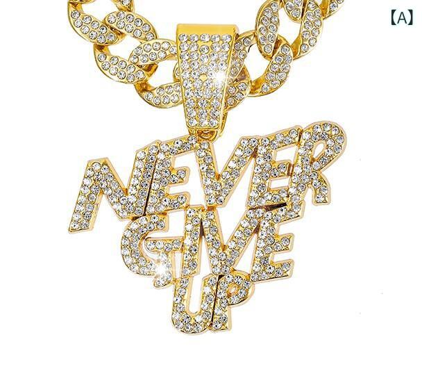 ネックレス メンズ ロング アルファベット NEVERGIVEUP メッセージ ラインストーン ペンダント 合金製 ゴールド シルバー パンク ヒップホップ ストリート 欧米風 キューバンチェーン