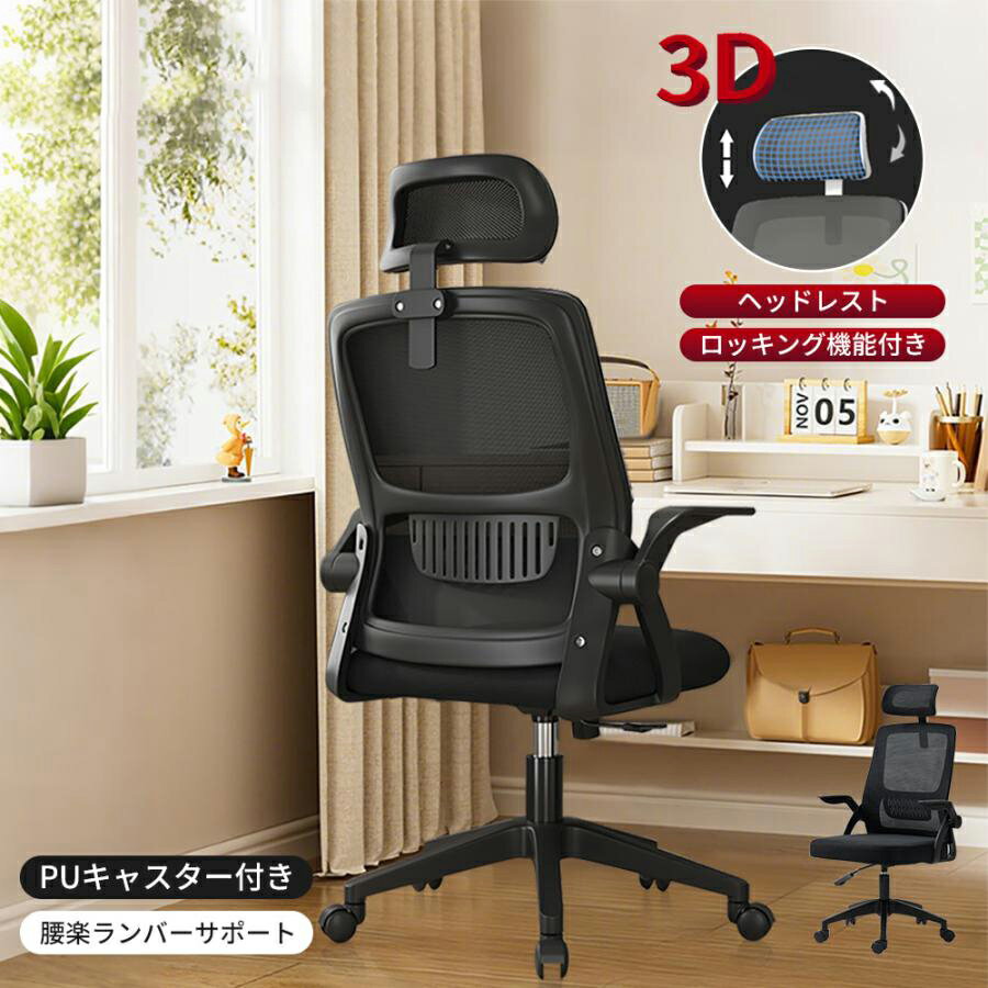 【商品仕様】商品サイズ:幅49×奥行46×高さ110-120cm (座面高さ:40~48cm) 本体:強化ナイロン樹脂 脚部:ナイロン クッション材:ラテックス 【背面覆うハイバック仕様】背もたれは背中のカーブに沿ってフィットする構造「S」字構造デザイン。後ろからランバーサポートで腰を支え、疲れを軽減します。ヘッドレスト高さ(40mm)と角度調節が可能なため、体格や姿勢に合わせて簡単に調節できます。 【座面昇降・ロッキング機能】カンタン昇降で使う人に合わせて、最適な高さが調整可能。座面が揺れるロッキング機能を、背伸びしてリフレッシュ! 【高反発3Dボリューム座面】お尻を自然に最適位置にホールドしてくれ、疲れにくい姿勢に導きます。 【通気性良い】通気性抜群が特徴のメッシュ生地の中でも高品質なポリエステルメッシュを厳選し、年間を通して蒸れにくくて座りっぱなしでも快適に過ごせます。