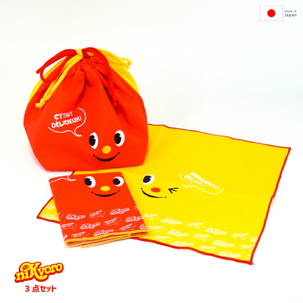 【店内最大P5倍】 お弁当箱 巾着 保冷 巾着袋 ランチボックス 子供 【 ニッキョロ 巾着ポーチ & ミニハンカチ2枚 3点 セット 】 入園 プレゼント 子ども 女子 男子 おしゃれ 幼稚園 小学生 お弁当 スプーン 給食 保温 ポーチ 給食袋 日本製 400ml以下