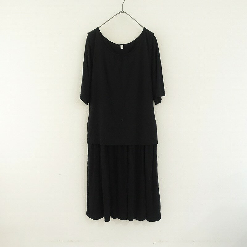 表記サイズ:なし 実寸サイズ:肩幅38cm, 身幅43cm, 着丈99cm, 裄丈49cm, ウエスト幅42cm, ヒップ幅48cm (多少の誤差はご了承ください) 素材:表地:レーヨン67%,トリアセテート33% 日本製 デザイン:duna by petite robe noireのアンサンブルデザインジャージワンピースです。カラーはブラックです。レーヨンとトリアセテートの落ち感がある薄手のジャージー生地を使用。ロールアップスリーブのウエスト切替ギャザーを配したワンピースと、ネックギャザーを配したタンクトップの重ね着風にデザインされたワンピースです。肩の縫い合わせと、腰サイドのボタン(ワンピース)×ループ(トップス)で閉じられています。スカート部分は2枚仕立て透け感はございません。ポケットはございません。 状態:ユーズドではございますが、目立ったシミ汚れはございません。SNO.0918 NO.2-2504-453