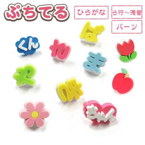 すきなベースをえらんで、ぷちっちゃおっ! 別売りのベースの穴にパーツを刺し込んで完成です! ●サイズ:約1cm ひらがな ら行 わ行 ちゃん くん 中棒 濁音 半濁音 小文字 モチーフ ハート 星 クローバー リボン さくらんぼ チューリップ キャンディ 花