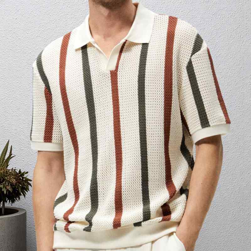 メンズ ニットポロシャツ ローゲージ 透かし編み ストライプ 配色 薄手 ポロ襟 サマーニット カジュアル 普段使い 通気性 洗濯機洗い可 ビスコース カーキ