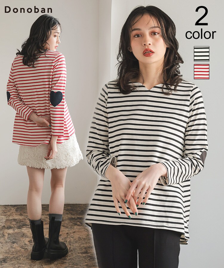 トップス レディース ボーダー カットソー プルオーバー ロンt 長袖 ボーダートップス ハート ハートネック スクエアネック 重ね着 エルボーパッチ Donoban|春 秋 コットン ワンポイント 体型カバー ゆったり 着痩せ 大人 ドノバン