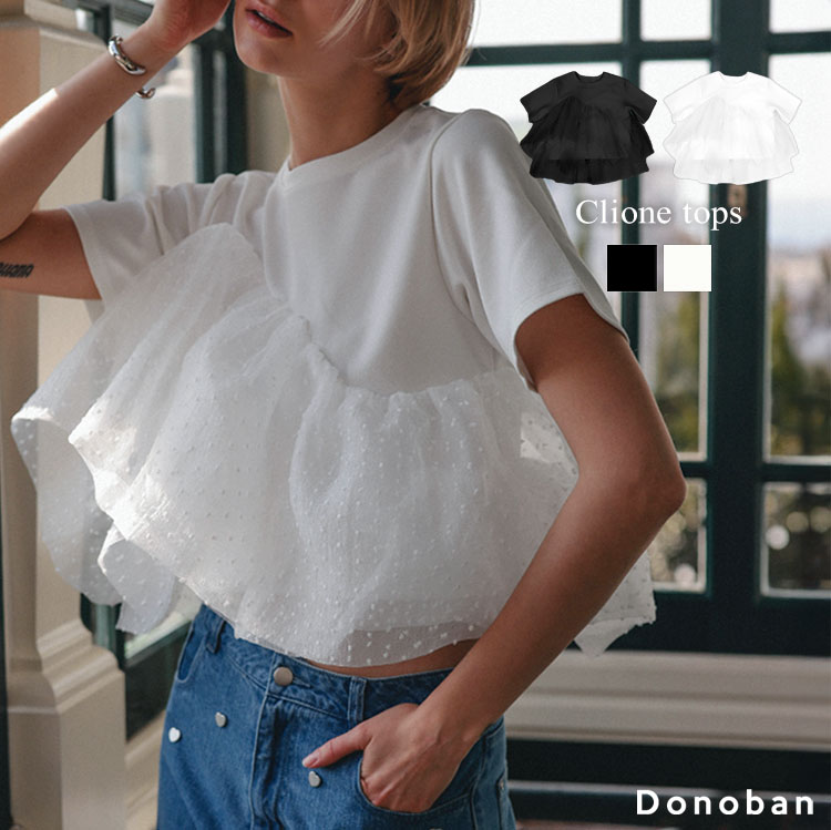 【クーポン利用で8316円!】トップス レディース カットソー 半袖 Tシャツ Tシャツ シアー ドット フリル オーガンジー レイヤード ドッキング 伸縮性 ストレッチ 無地 クリオネ Donoban|韓国ファッション 春服 夏服 体型カバー 着痩せ オケージョン セレモニー ドノバン
