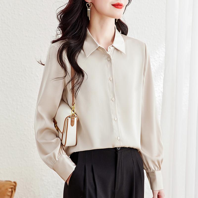 春 コーデ レディース ファッション オシャレ カワイイ シンプル きれいめ ナチュラル 上品カジュアル 婦人服 サテンシャツ トップス ゆったり 長袖 シャツ