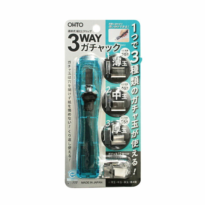 << 3WAYガチャック >> 3種類のガチャ玉が1つの本体で使用できるガチャックです。 ガチャ玉 合計12発付き 薄玉・中玉・厚玉 各4発 ◎薄玉(コピー用押20枚まで) ◎中サイズのガチャ玉(コピー用押40枚まで) ◎厚玉(コピー用押55枚まで) さらに押し出しをしやすくしたスライダーと上向きの押し出しも、 玉の連続送り出しも可能にし全てが進化したガチャックです。 ●つまみのないスマートなクリップ(綴じ具)紙を傷めず、くり返し使える経済的「リユース」商品。 ●ガチャ玉を本体にセット。はさみ口で紙をはさみ、スライダーでガチャ玉を押し出します。 ●かさばらずしっかり書類を固定できます ●ガチャ玉は何度でも使用可能です。 ◆材質 本体:再生PC ガチャ玉:ステンレス ◆本体サイズ:W30×H27.2×D138.7mm、28.7g (ガチャ玉 未装填時の重量です。) ◆ブリスターパックサイズ:本体 約 W90×H190×D29mm、54g ◆使用可能ガチャ玉:GGU-5(薄)、GGS-5N(中)、GGA-5(厚)、ガチャ玉 中 GGS-5 【品番・色・JAN】 G3W-600-BL ブルー 4971516024094 G3W-600-CL クリア 4971516024100 G3W-600-PK ピンク 4971516024117 G3W-600-BK ブラック 4971516024124 ※メーカーの都合等により、商品規格・仕様(容量、パッケージ、原材料、原産国など)が変更される場合がございます事をご了承お願いいたします。 ・3WAYガチャック・ガチャック各種本体 ・各サイズガチャ玉・3WAY専用ガチャ玉 こちらをクリック↓↓↓↓