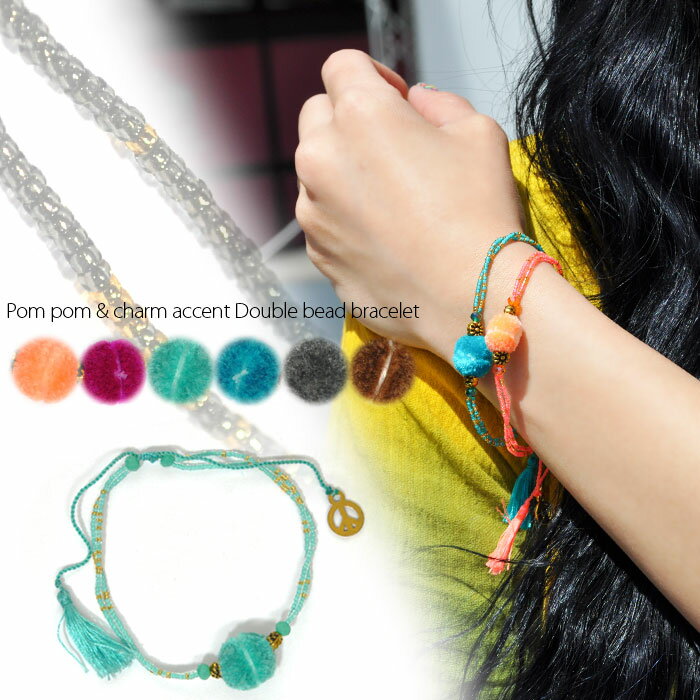 エスニック【メール便OK】ポンポン&チャームアクセント★スリムビーズ二連ブレスレット( アジアン エスニック ファッション ジュエリー お守り 重ね着け オソロイ おそろい ペア プレゼント 2連 タッセル Mana)