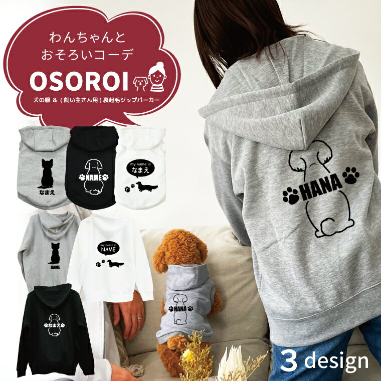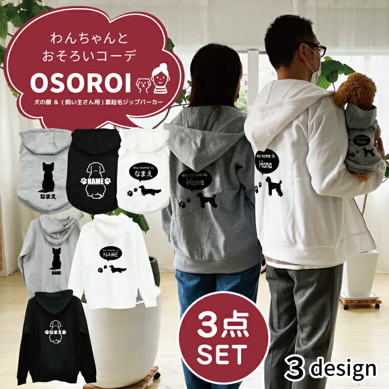 [送料無料]わんちゃんとおそろいコーデ「OSOROI」 フーディー1枚&ジップパーカー2枚 カーシヴ 筆記体 犬種が選べる ワンちゃんシルエット 厚手 裏起毛 犬とペアルック 3点セット 犬の服 ドッグウェア 犬とお揃い 名入れ 名前入り ギフト プレゼント