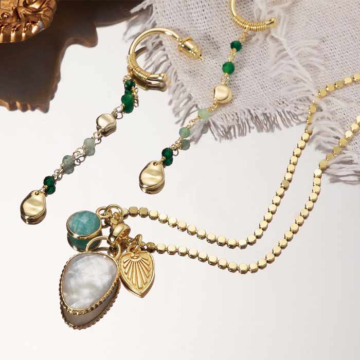 サイズ 縦 約2.5センチ横 2センチチェーン:45~50センチ(アジャスター5センチ含む) 素材 真鍮ゴールドメッキ白蝶貝水晶(染) 特徴など 海外ブランドらしいデザインの ペンダント。チャームとヘッドの組み合わせはバランスも良く艶やかに着飾ってくれます。誕生日、クリスマス、ギフト、プレゼントに最適な商品です。 注意 天然石の為、1つ1つ見え方が異なることがございます。予めご了承ください。*Bruncesta(ブランチェスタ)ではなるべく画像と同じ色味をご用意しております。AZUNI アズニ ブランド:AZUNI アズニ アシュレー・マーシャルが設立した、ロンドンのジュエリー ブランド。 1995 年マヤ文化の手法を用いたジュエリー コレクションを発表。 このコレクションはポールスミスや百貨店のリバティなどのショップで取扱われ人気になりました。 最近では天然石を使用したピアスを英国キャサリン妃が着用したことで 話題にもなりました。 デザイナー1つ1つ大切にデザインをしています。 ブランド発祥の地イギリスでも大人気のブランドの為、入荷にはお時間を頂戴することがあります。 母の日、クリスマス、ギフト、プレゼントに最適な商品です。 こちらの商品はピアスの為、衛生上の理由から大変申し訳ありませんが、返品や交換をお受けすることが出来ません。 また色のサイズやイメージ違いによる返品や交換もお受けできませんのでご了承ください。 Related Products