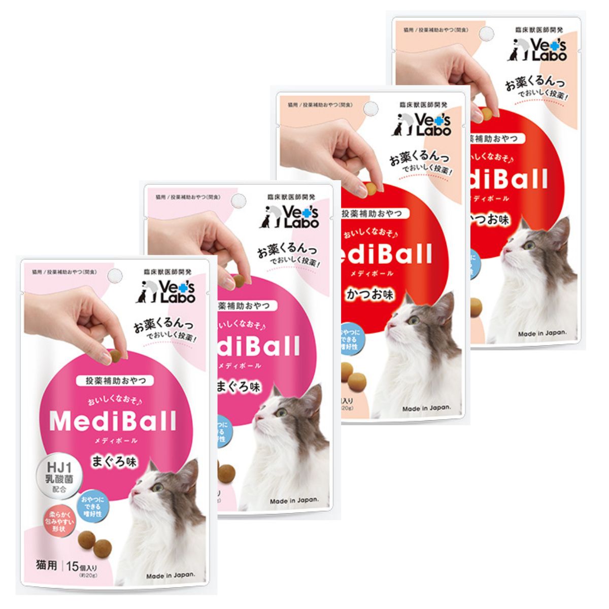 メディボールはお薬が苦手なネコちゃんのために獣医師と共同で開発した投薬補助用のおやつです。 ★飲みにくいお薬をくるんっと包んでおいしく投薬★ ペットにとっても、ペットオーナーにとってもストレスとなる投薬。処方された薬をメディボールに包み込んで与えることで、隠された薬に気付かずに食べてくれます。与えやすく飽きにくい美味しさに、臨床獣医師がこだわって開発した投薬補助おやつです。 ★与え方★ 1日に与える量は、猫種、年齢、運動量、季節、個体によって変わります。 それらを考慮の上、下記表を参考に1日数回に分けてお与えください。 成猫: 4個以内 ★注意事項★ ※本商品は愛猫用のおやつです。主食としてお与えにならないでください。 ※食べすぎるおそれがありますので給与量の目安をお守りください。 ※ペットの体調などにより、商品が合わない場合もあります。異常にお気づきの際は、使用を控え獣医師にご相談ください。 ※品質保持のための脱酸素材は無害ですが食べ物ではありません。開封後は賞味期限に関わらずなるべく早くお与えください。 ※加工上の都合により、形状・サイズ・色・硬さに多少のばらつきが出ることがございますが、品質には問題ありません。 ※子供がペットに与えるときは、安全のため大人が立ち会ってください。 ※生後6ヶ月未満の幼猫にはお与えにならないでください。メディボールはお薬が苦手なネコちゃんのために獣医師と共同で開発した投薬補助用のおやつです。 ★飲みにくいお薬をくるんっと包んでおいしく投薬★ ペットにとっても、ペットオーナーにとってもストレスとなる投薬。処方された薬をメディボールに包み込んで与えることで、隠された薬に気付かずに食べてくれます。与えやすく飽きにくい美味しさに、臨床獣医師がこだわって開発した投薬補助おやつです。 ★与え方★ 1日に与える量は、猫種、年齢、運動量、季節、個体によって変わります。 それらを考慮の上、下記表を参考に1日数回に分けてお与えください。 成猫: 4個以内 ★注意事項★ ※本商品は愛猫用のおやつです。主食としてお与えにならないでください。 ※食べすぎるおそれがありますので給与量の目安をお守りください。 ※ペットの体調などにより、商品が合わない場合もあります。異常にお気づきの際は、使用を控え獣医師にご相談ください。 ※品質保持のための脱酸素材は無害ですが食べ物ではありません。開封後は賞味期限に関わらずなるべく早くお与えください。 ※加工上の都合により、形状・サイズ・色・硬さに多少のばらつきが出ることがございますが、品質には問題ありません。 ※子供がペットに与えるときは、安全のため大人が立ち会ってください。 ※生後6ヶ月未満の幼猫にはお与えにならないでください。