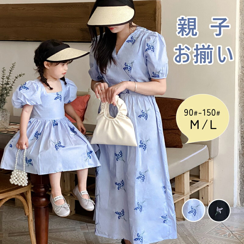 ワンピース バルーン袖 親子ペア 親子お揃い 親子コーデ 母女 姉妹 綿 花柄 ブラック ブルー 水色 お揃い ママ 娘 大人 子供 レディース キッズ 女の子 可愛い 日常着 オシャレ 夏 海 ビーチ 旅行 撮影 プレゼント