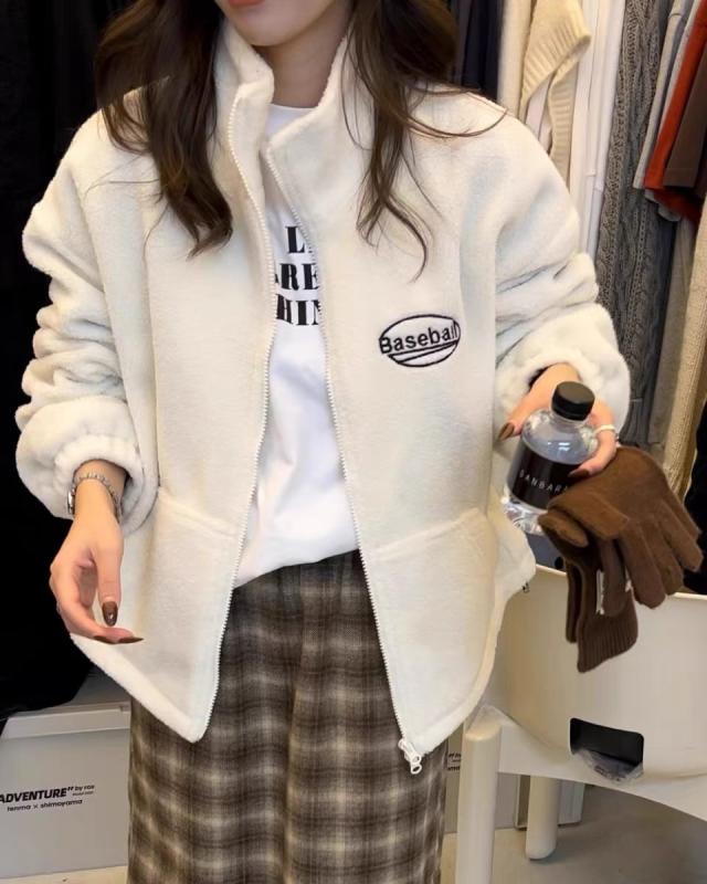 ジャケット レディース 秋冬 ブルゾン ジャンパー ゆったり かわいい 刺繡 ロゴ トップス アウター 女性用 カジュアル 防寒 あったか 起毛 韓国 ブラック レッド ベージュ ネイビー M L XL 2XL 3XL