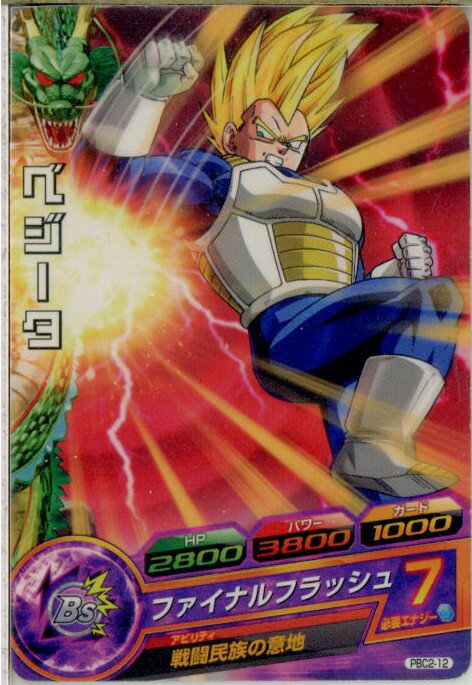【必ずご確認ください】・プレイに支障のない、多少のスレ・キズ・白むけ・汚れ等がある『プレイ用』の商品となります。折れ・メクレ・破れ等は御座いませんが、カードの状態に付いてのお問い合わせは、対応できかねますのでご遠慮くださいますようお願いいたします。・ゲームプレイのみをご希望の方は、以上をご了承の上、是非ご検討くださいませ。【商品説明】--------------------【基本情報】■タイトル:ドラゴンボールヒーローズ PBC2-12 ベジータ■機種:ドラゴンボールヒーローズ(Dragon Ball Heroes)■発売日:2014/01/01■メーカー品番:PBC2-12■レアリティ:-■配布:ドラゴンボールヒーローズ カードグミ2■必殺技名:ファイナルフラッシュ/必要エナジー:7HP2800/パワー3800/ガード1000/タイプBS/【商品説明】■アビリティ:戦闘民族の意地■アビリティ効果ラウンド開始時、自分チームのHPが20%以下になっていると、パワー+3000。メディアワールド買取価格お問合せ【メディアワールド公式カイトリワールド】高価買取サービスはこちら≫≫楽天市場様の許可のもと、買取のご案内をしております【新品即納】及び【中古】表記の商品は、PM13時までのご注文で通常即日出荷いたします。(最終ご入金確認PM14時)年中無休で営業しておりますので、ご不明な点やご質問等ございましたらお気軽にお問い合わせください。【中古】[TCG]ドラゴンボールヒーローズ PBC2-12 ベジータ【ラッピングは注文確認画面でご指定ください】