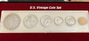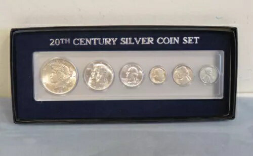 ヴィンテージ 20 世紀シルバー 米国コイン 6 個セット、ギフトボックス入り、1 セントから 1 ドル