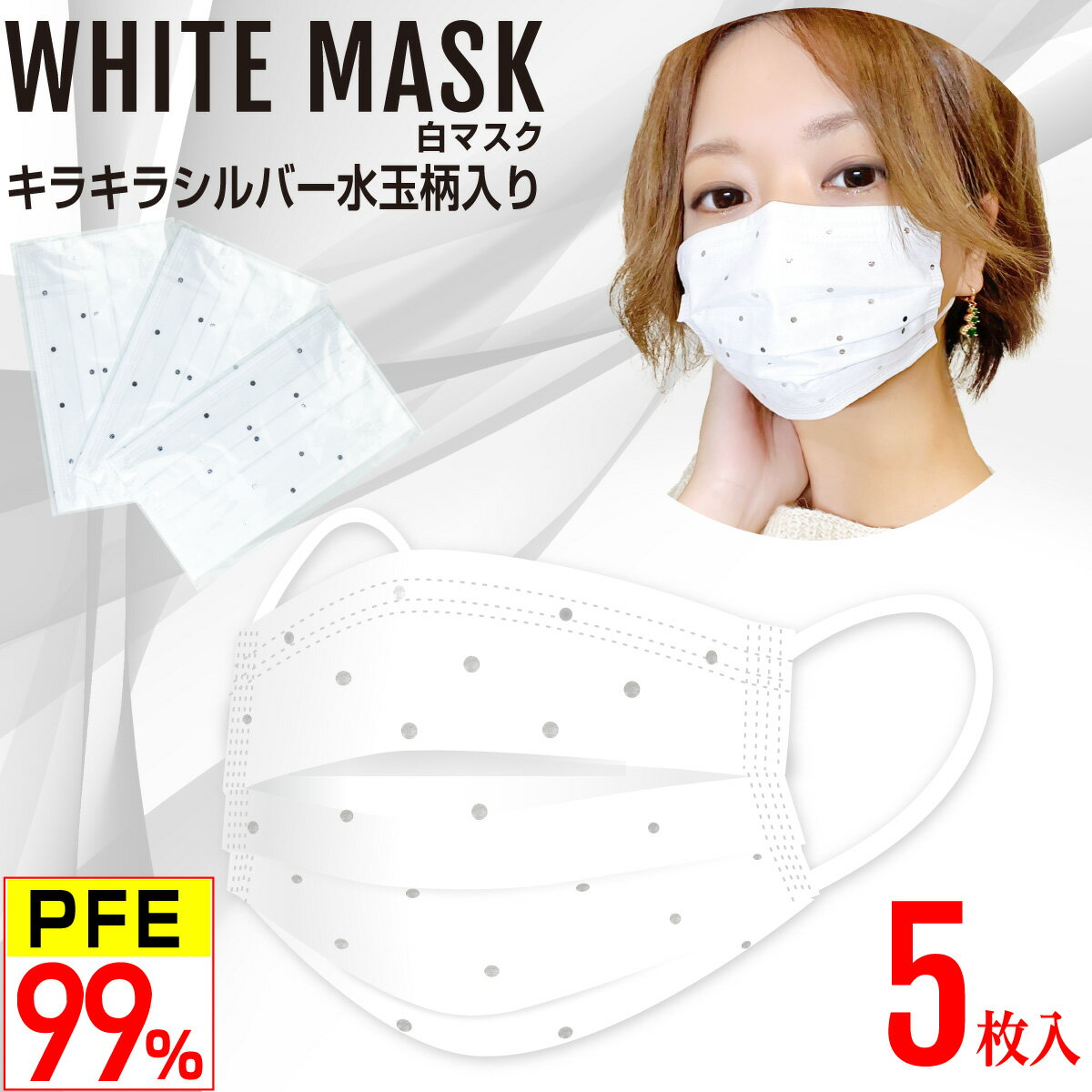【レビューで100円クーポン】水玉柄 白マスク キラキラ銀(シルバー) 【キラキラマスク】 不織布マスク 4層 PFE99%以上 PM2.5対応 高性能フィルター 個別包装 5枚入 男女兼用 使い捨て おしゃれマスク