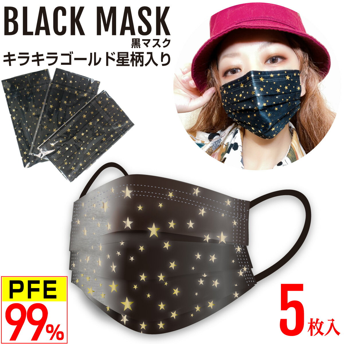 【レビューで100円クーポン】星柄 黒マスク キラキラ金(ゴールド) 【キラキラマスク】 不織布マスク 活性炭入り 5層 PFE99%以上 PM2.5対応 高性能フィルター 個別包装 5枚入 男女兼用 ブラックマスク 使い捨て おしゃれマスク