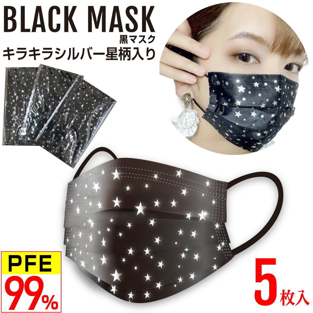 【レビューで100円クーポン】星柄 黒マスク キラキラ銀(シルバー) 【キラキラマスク】 不織布マスク 活性炭入り 5層 PFE99%以上 PM2.5対応 高性能フィルター 個別包装 5枚入 男女兼用 ブラックマスク 使い捨て おしゃれマスク