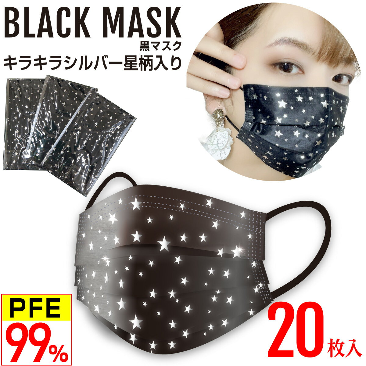 【レビューで100円クーポン】星柄 黒マスク キラキラ銀(シルバー) 【キラキラマスク】 不織布マスク 活性炭入り 5層 PFE99%以上 PM2.5対応 高性能フィルター 個別包装 20枚入 男女兼用 ブラックマスク 使い捨て おしゃれマスク