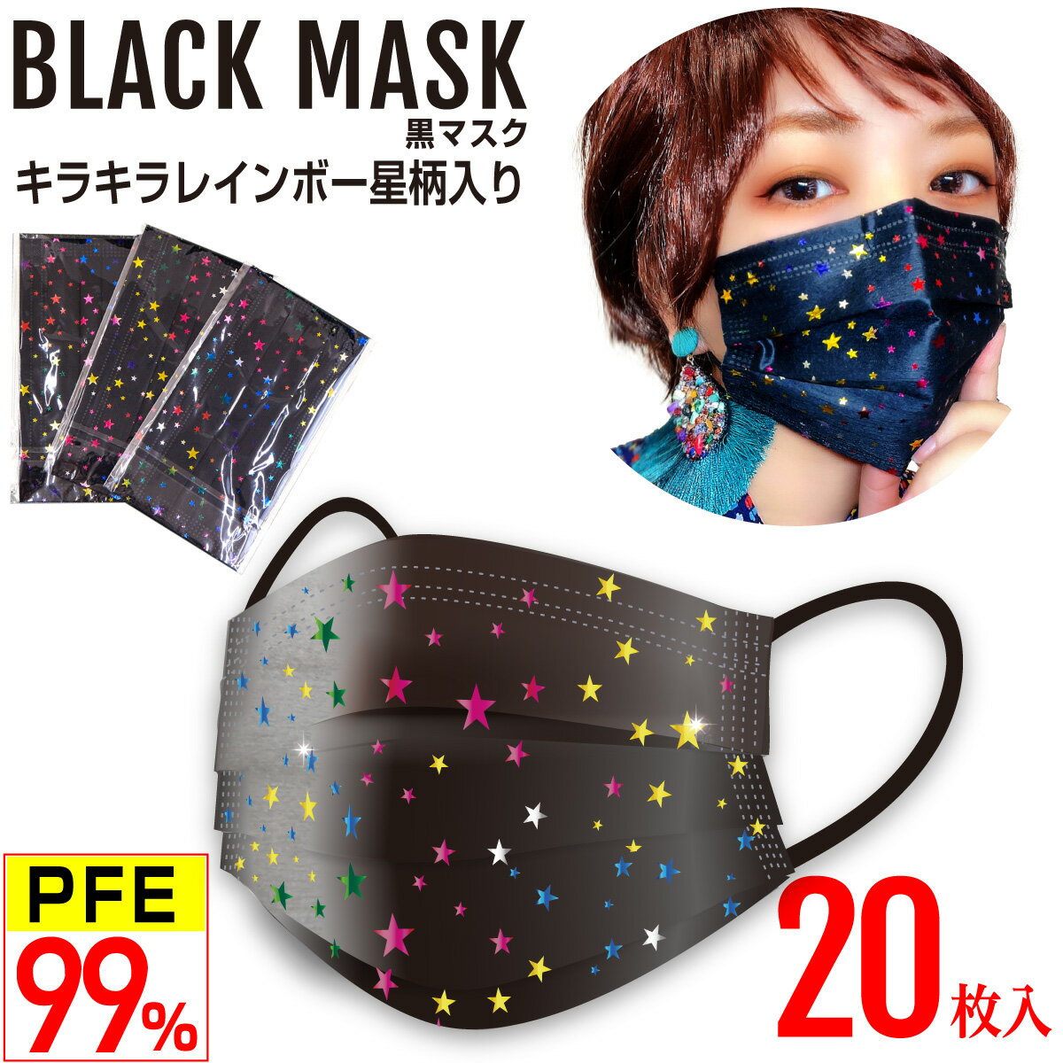【レビューで100円クーポン】星柄 黒マスク キラキラレインボー 【キラキラマスク】 不織布マスク 活性炭入り 5層 PFE99%以上 PM2.5対応 高性能フィルター 個別包装 20枚入 男女兼用 ブラックマスク 使い捨て おしゃれマスク